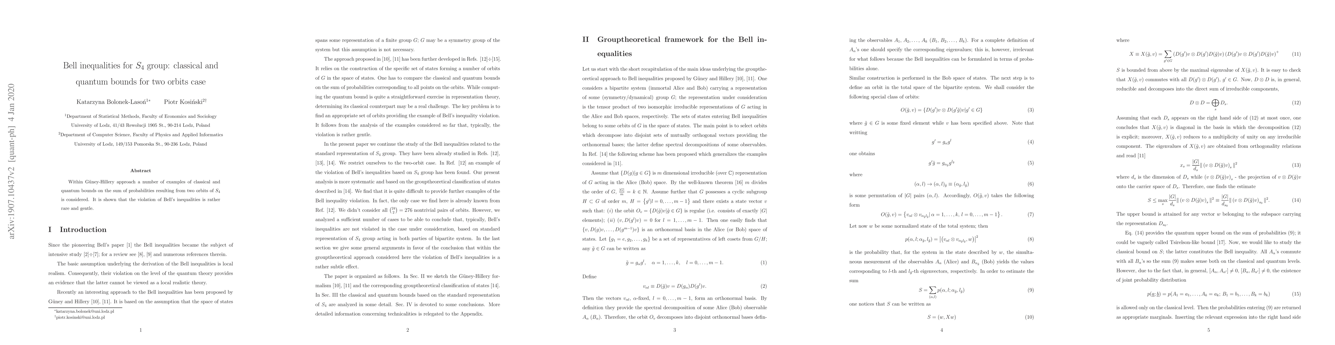 Within Guney-Hillery approach a number of examples of classical and quantum bounds on sum of probabilities resulting from two orbits of $S_4$ is considered. It is shown that the violation of Bell's inequalities is rather rare and gentle.