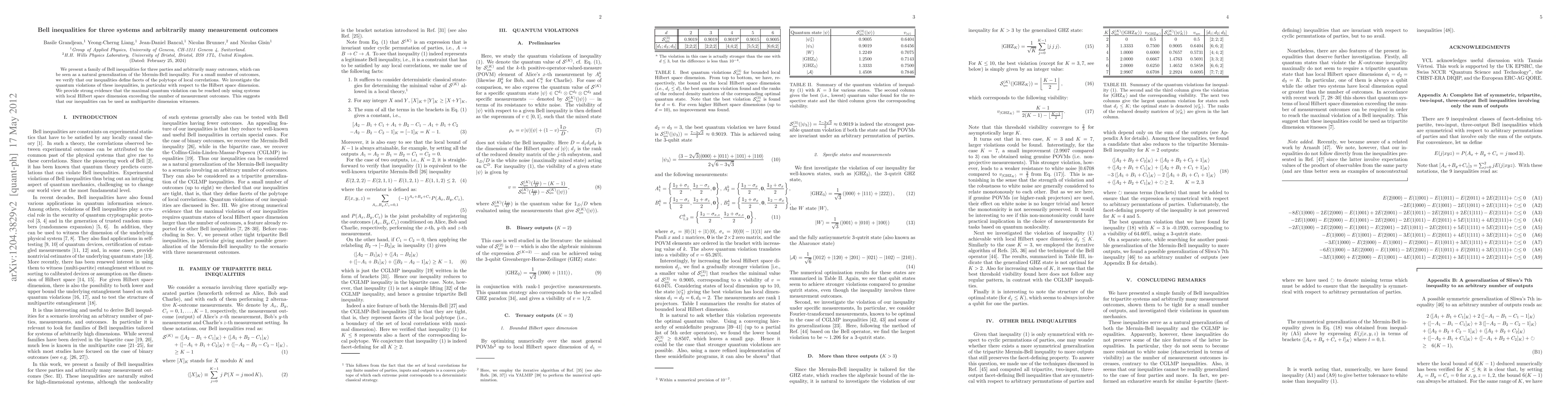 This paper presents a generalized set of Bell inequalities for three parties and multiple measurement outcomes, extending the Mermin inequality. It demonstrates that these inequalities can serve as multipartite dimension witnesses, indicating that maximal quantum violations require systems with dimensions exceeding the number of outcomes.