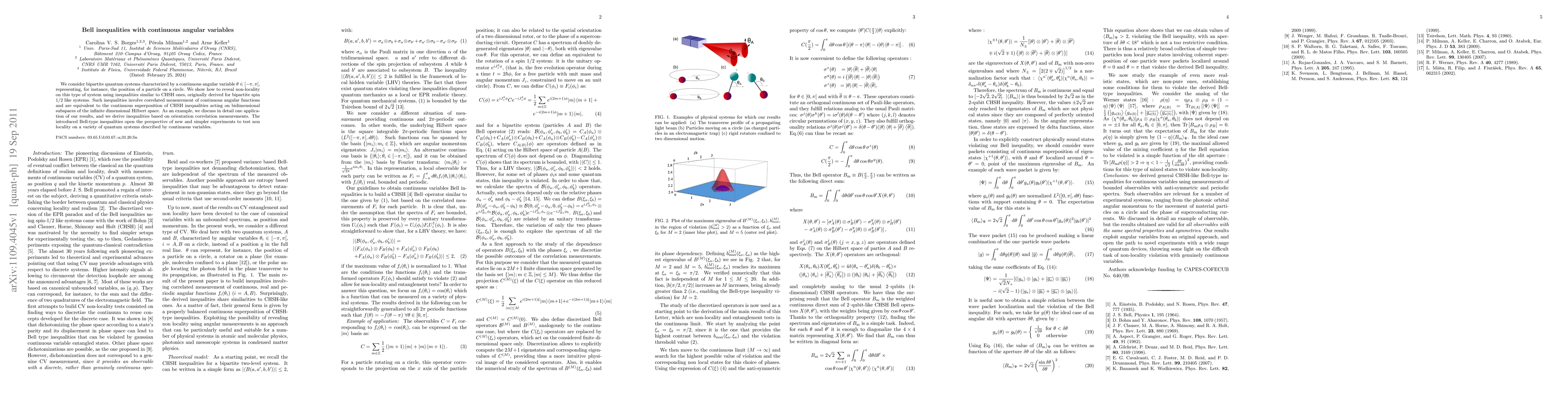 This paper presents Bell inequalities for bipartite quantum systems with continuous angular variables, analogous to CHSH inequalities for spin systems. The study reveals non-locality through correlated measurements of continuous angular functions, offering potential for simpler experiments to test quantum non-locality in systems with continuous variables.
