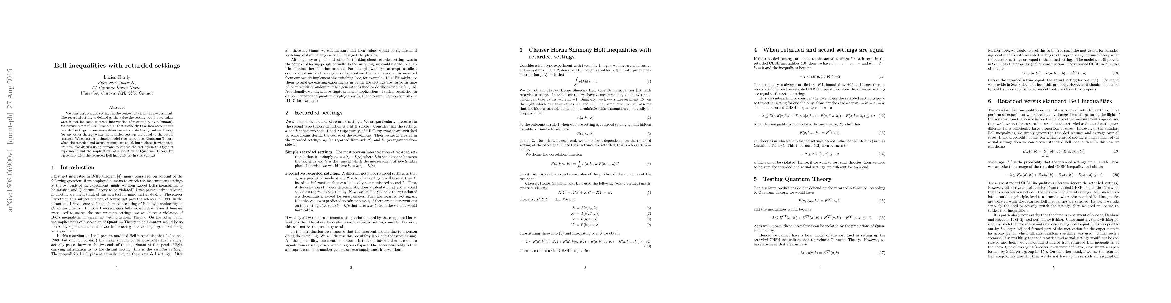 This paper explores Bell inequalities under "retarded settings," which represent the settings without external intervention, and derives new inequalities that hold true for Quantum Theory when the actual settings match the retarded ones. The study constructs a model that aligns with Quantum Theory under these conditions but diverges when the settings differ, discussing the implications of potential violations in experiments involving human-selected settings.