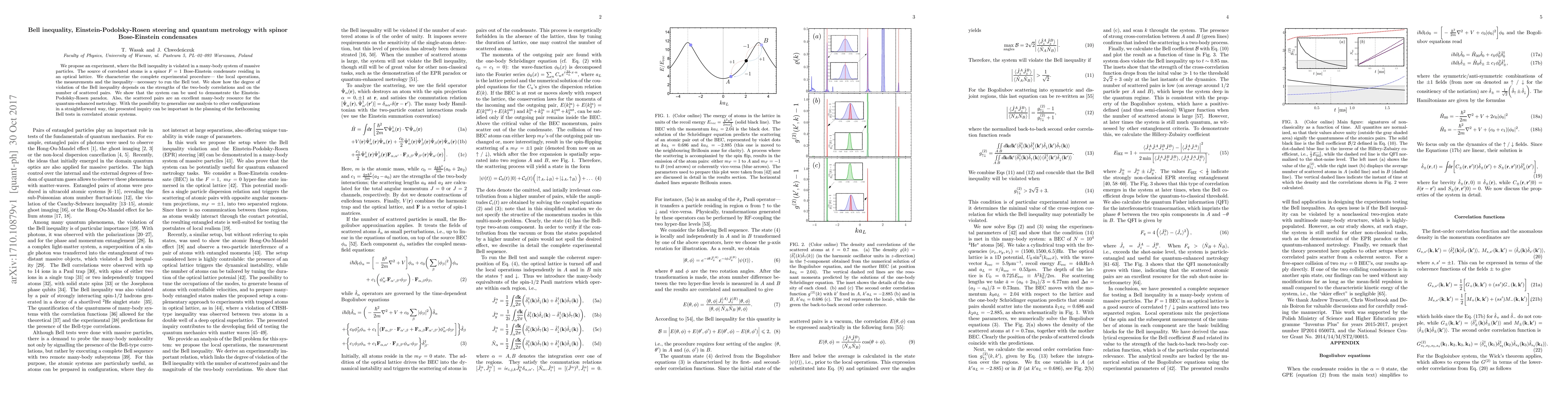 This paper proposes an experiment to violate the Bell inequality using a spinor Bose-Einstein condensate in an optical lattice, demonstrating the Einstein-Podolsky-Rosen paradox and showcasing the system's potential for quantum-enhanced metrology. The study details the experimental setup and shows how the degree of Bell inequality violation correlates with two-body interactions and the number of atom pairs.