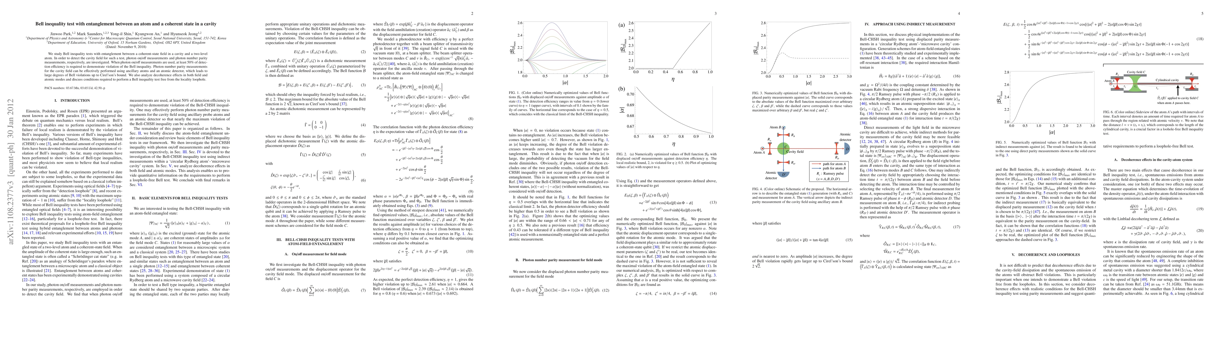 This paper investigates Bell inequality tests using entanglement between a coherent-state field in a cavity and a two-level atom, demonstrating significant violations of the Bell inequality through photon number parity measurements. It also examines decoherence effects and conditions necessary to perform such tests free from the locality loophole.