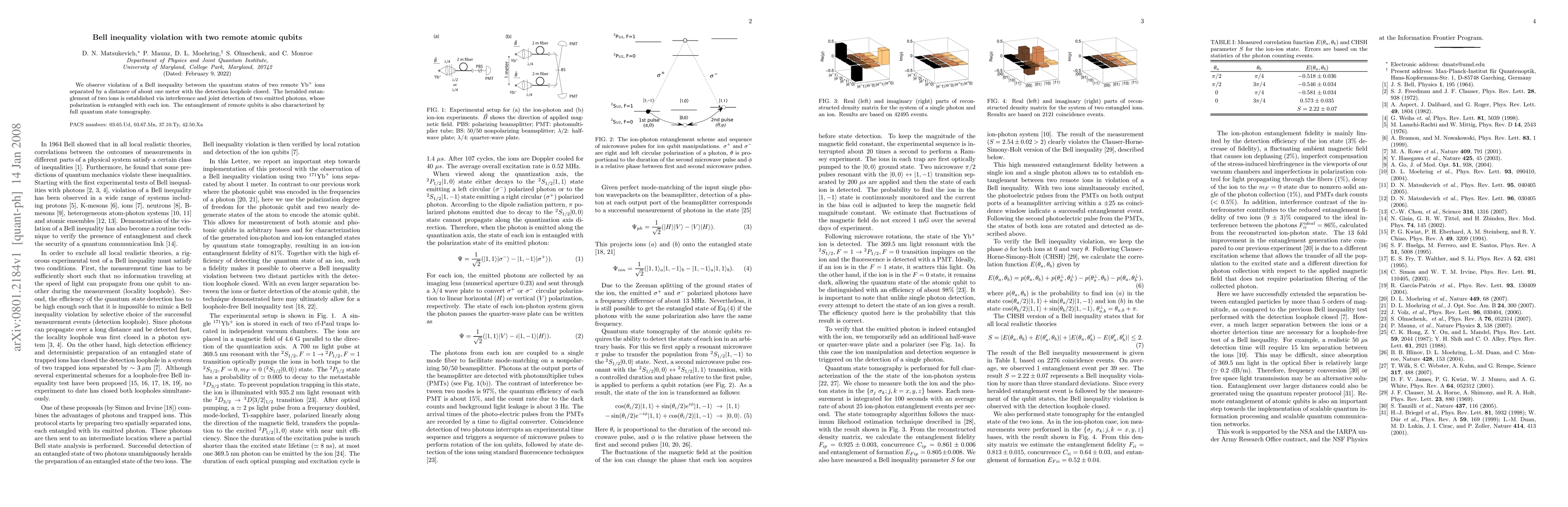 This study demonstrates a Bell inequality violation between two remote Yb ions separated by a meter, confirming entanglement via interference and joint detection of entangled photons, with full quantum state tomography characterizing the remote qubits. The detection loophole is closed, reinforcing the results.