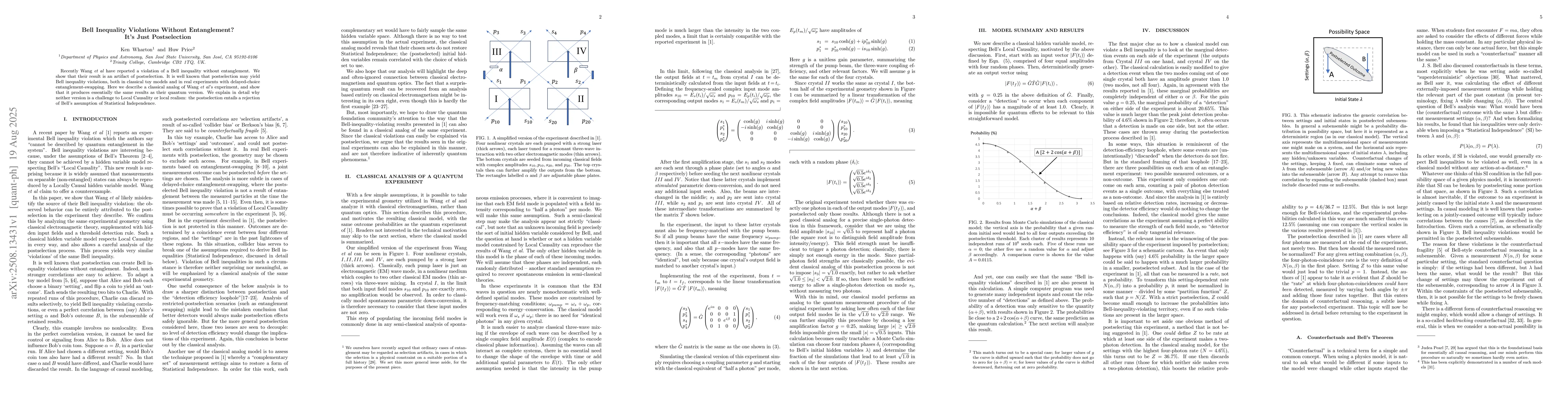 Recently Wang et al. have reported a violation of a Bell inequality without entanglement [arXiv:2507.07756]. We show that their result is an artifact of postselection. It is well known that postselection may yield Bell inequality violations, both in classical toy models and in real experiments with delayed-choice entanglement-swapping. Here we describe a classical analog of Wang et al.'s experiment, and show that it produces essentially the same results as their quantum version. We explain in detail why neither version is a challenge to Local Causality or local realism: the postselection entails a rejection of Bell's assumption of Statistical Independence.