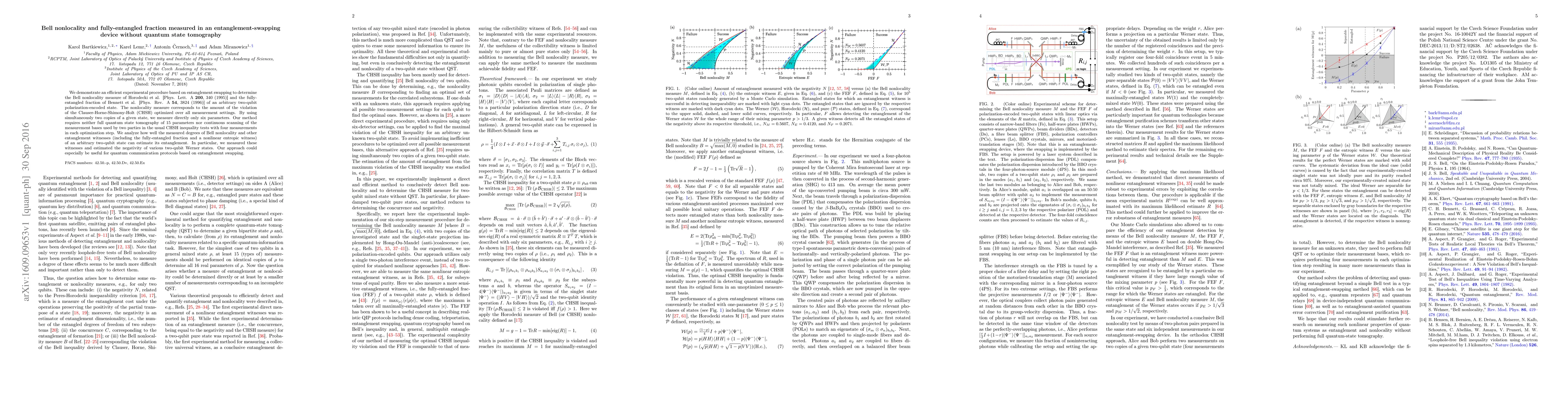 This paper presents an efficient experimental method for measuring Bell nonlocality and the fully-entangled fraction of two-qubit states using entanglement swapping, without requiring full quantum state tomography. The method directly measures six parameters, simplifying the process compared to traditional methods.