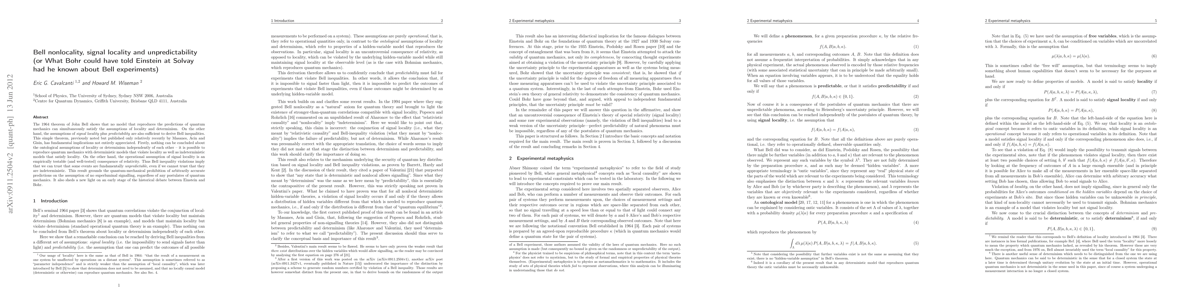 This paper discusses Bell's theorem, showing that quantum mechanics cannot satisfy both locality and determinism. It highlights that signal locality, a relativity-based assumption, and predictability are sufficient to derive Bell inequalities, thus implying fundamental unpredictability even if determinism is maintained.