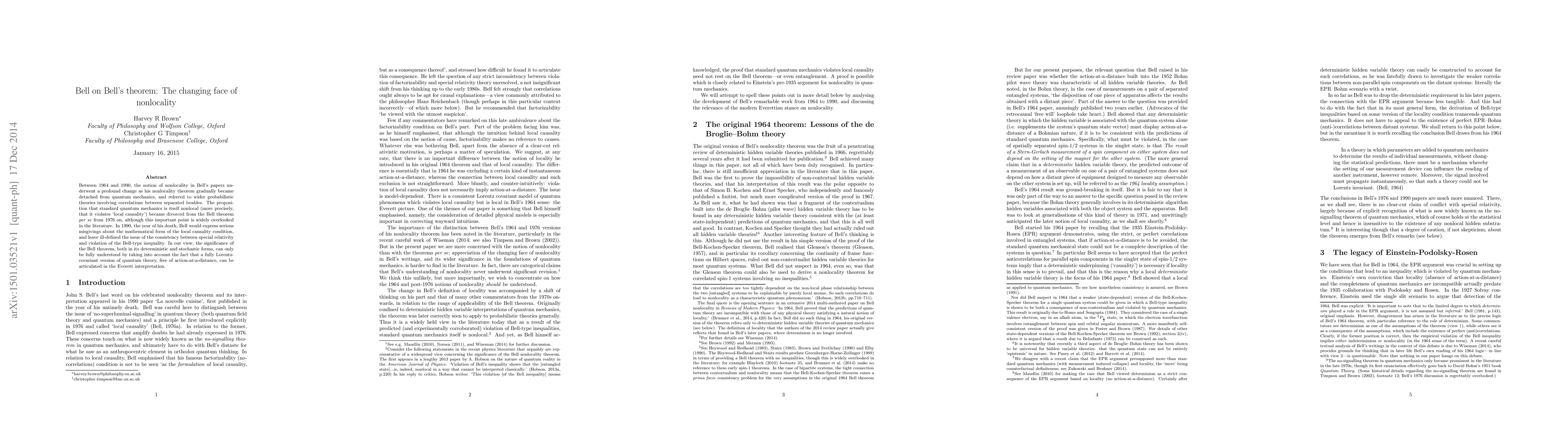 Between 1964 and 1990, the notion of nonlocality in Bell's papers underwent a profound change as his nonlocality theorem gradually became detached from quantum mechanics, and referred to wider probabilistic theories involving correlations between separated beables. The proposition that standard quantum mechanics is itself nonlocal (more precisely, that it violates `local causality') became divorced from the Bell theorem per se from 1976 on, although this important point is widely overlooked in the literature. In 1990, the year of his death, Bell would express serious misgivings about the mathematical form of the local causality condition, and leave ill-defined the issue of the consistency between special relativity and violation of the Bell-type inequality. In our view, the significance of the Bell theorem, both in its deterministic and stochastic forms, can only be fully understood by taking into account the fact that a fully Lorentz-covariant version of quantum theory, free of action-at-a-distance, can be articulated in the Everett interpretation.