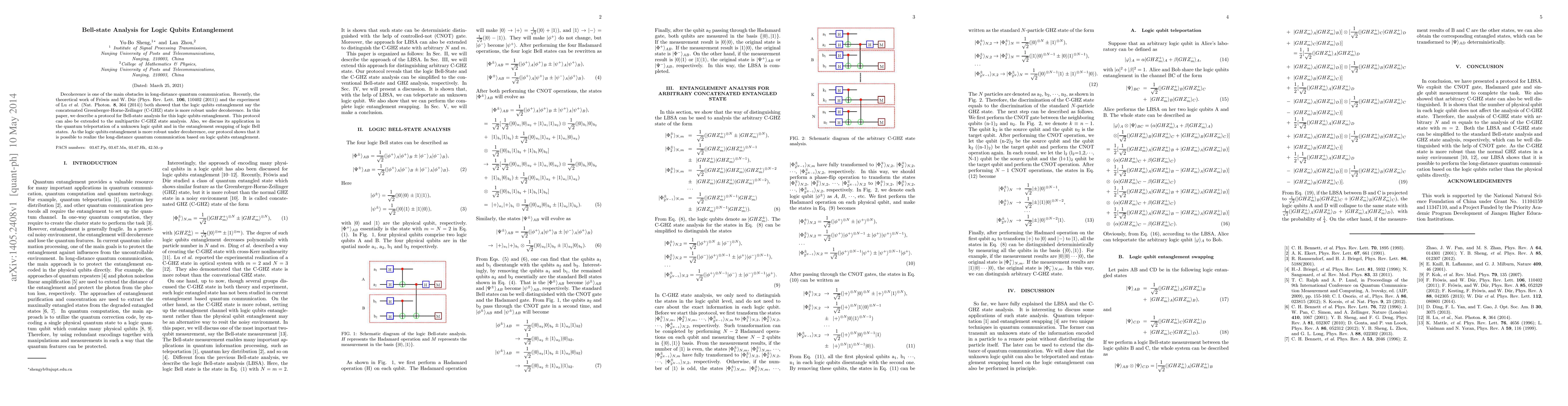 This paper proposes a protocol for Bell-state analysis of logic qubits entanglement, specifically the concatenated Greenberger-Horne-Zeilinger (C-GHZ) state, which is shown to be more robust against decoherence. The protocol extends to multipartite C-GHZ states and has applications in quantum teleportation and entanglement swapping, suggesting its potential for long-distance quantum communication.