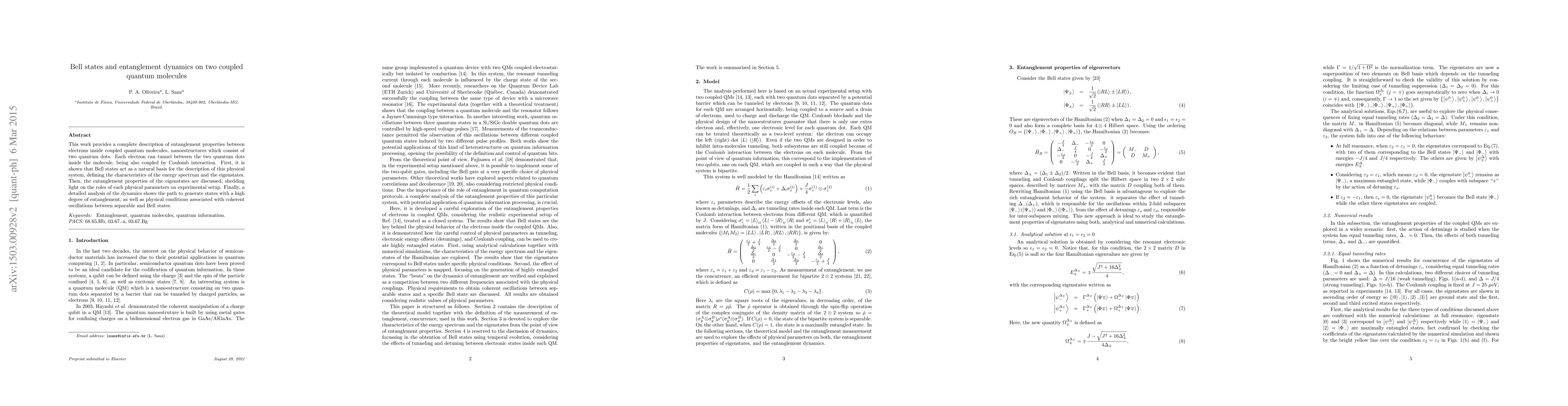 This work provides a complete description of entanglement properties between electrons inside coupled quantum molecules, nanoestructures which consist of two quantum dots. Each electron can tunnel between the two quantum dots inside the molecule, being also coupled by Coulomb interaction. First, it is shown that Bell states act as a natural basis for the description of this physical system, defining the characteristics of the energy spectrum and the eigenstates. Then, the entanglement properties of the eigenstates are discussed, shedding light on the roles of each physical parameters on experimental setup. Finally, a detailed analysis of the dynamics shows the path to generate states with a high degree of entanglement, as well as physical conditions associated with coherent oscillations between separable and Bell states.