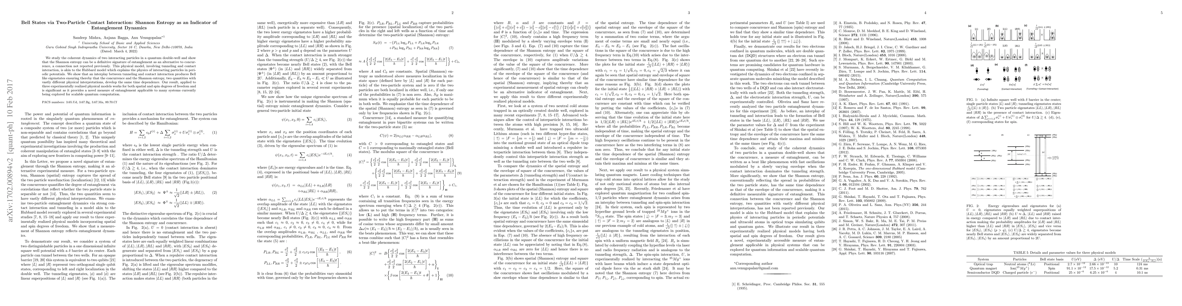 We study the coherent dynamics of two interacting particles in a quantum double-well and show that the Shannon entropy can be a definitive signature of entanglement as an alternative to concur- rence, a connection not reported previously. This physical model, involving tunneling and contact interaction, is akin to the Hubbard model which explains the physics of interacting particles in peri- odic potentials. We show that an interplay between tunneling and contact interaction produces Bell like eigenstates ensuring thereby that the concurrence and the Shannon entropy, two quantities with vastly different physical interpretations, develop the same time dependence. Our result, applied to three experimentally realized physical models works for both spatial and spin degrees of freedom and is significant as it provides a novel measure of entanglement applicable to many systems currently being explored for scalable quantum computation.
