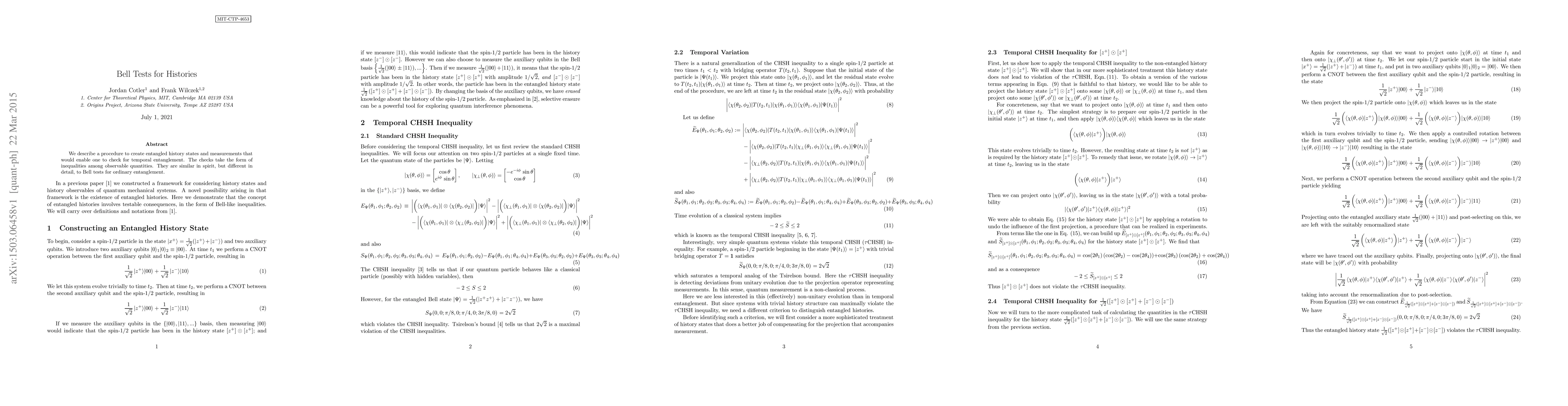 We describe a procedure to create entangled history states and measurements that would enable one to check for temporal entanglement. The checks take the form of inequalities among observable quantities. They are similar in spirit, but different in detail, to Bell tests for ordinary entanglement.