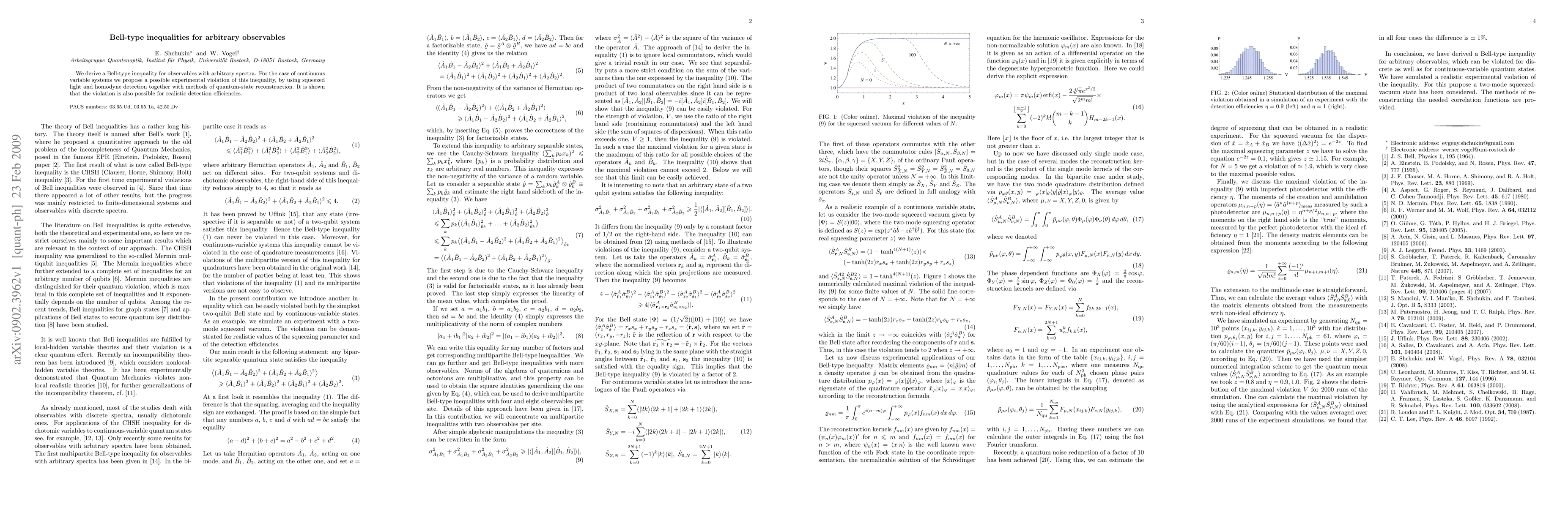 Researchers derive a Bell-type inequality for arbitrary observables, proposing an experimental setup to test its violation using squeezed light and homodyne detection with realistic detection efficiencies.
