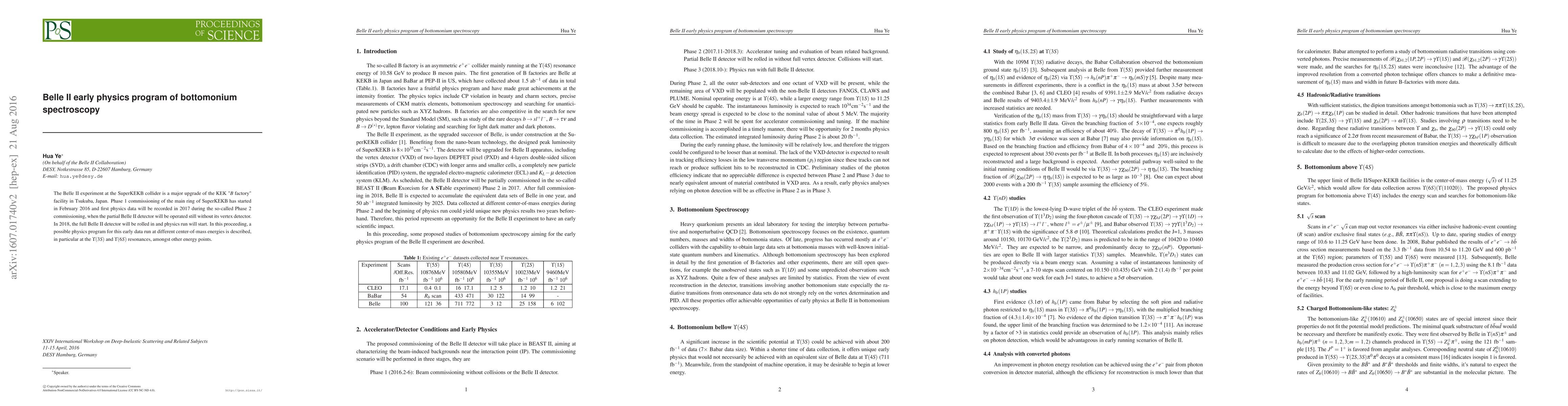 The Belle II experiment aims to study bottomonium spectroscopy using early data from the SuperKEKB collider, focusing on the $\Upsilon(3S)$ and $\Upsilon(6S)$ resonances during its Phase 2 commissioning in 2017, before full detector operation in 2018. This program seeks to explore the properties of bottomonium states at various center-of-mass energies.