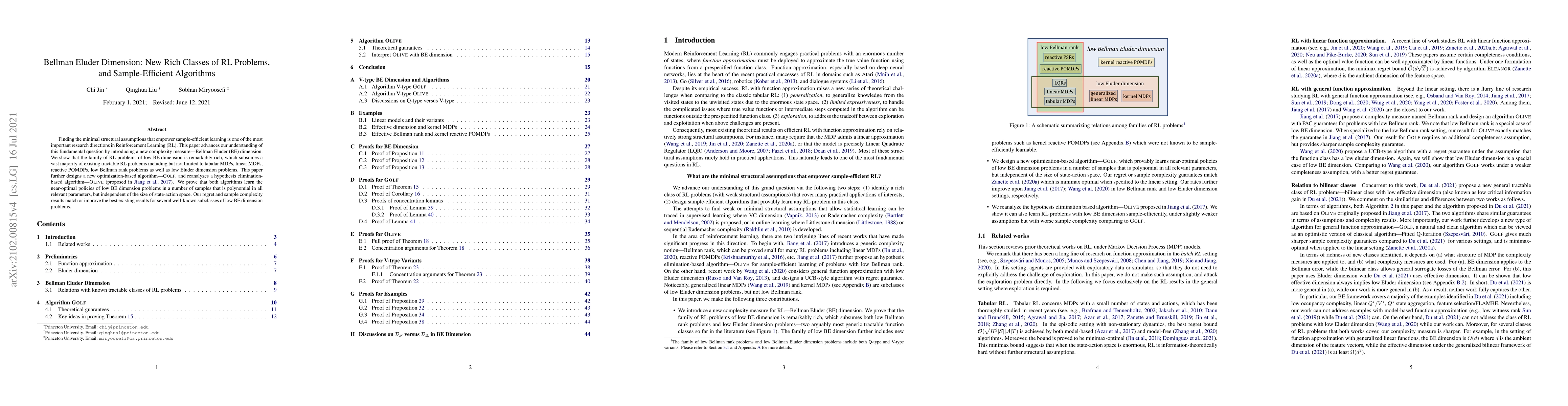 This paper introduces the Bellman Eluder dimension as a new complexity measure for Reinforcement Learning (RL) problems, demonstrating its applicability to a wide range of tractable RL problems. It presents two algorithms, GOLF and OLIVE, that achieve sample-efficient learning for low BE dimension problems, with sample complexity independent of the state-action space size.