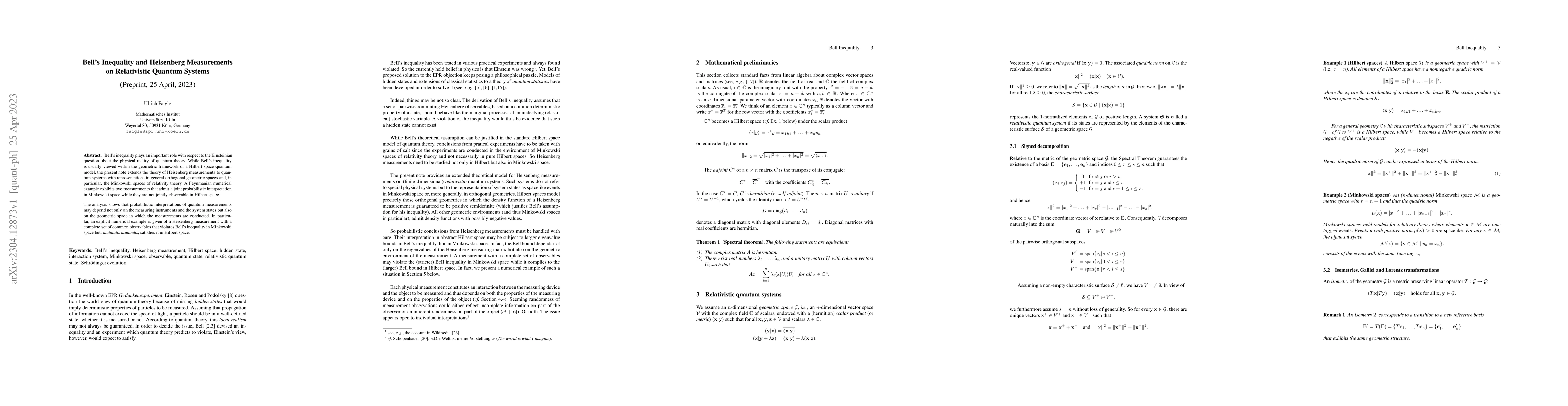 Bell's inequality plays an important role with respect to the Einsteinian question about the physical reality of quantum theory. While Bell's inequality is usually viewed within the geometric framework of a Hilbert space quantum model, the present note extends the theory of Heisenberg measurements to quantum systems with representations in general orthogonal geometric spaces and, in particular, the Minkowski spaces of relativity theory. A Feynmanian numerical example exhibits two measurements that admit a joint probabilistic interpretation in Minkowski space while they are not jointly observable in Hilbert space. The analysis shows that probabilistic interpretations of quantum measurements may depend not only on the measuring instruments and the system states but also on the geometric space in which the measurements are conducted. In particular, an explicit numerical example is given of a Heisenberg measurement with a complete set of common observables that violates Bell's inequality in Minkowski space but, mutatatis mutandis, satisfies it in Hilbert space.