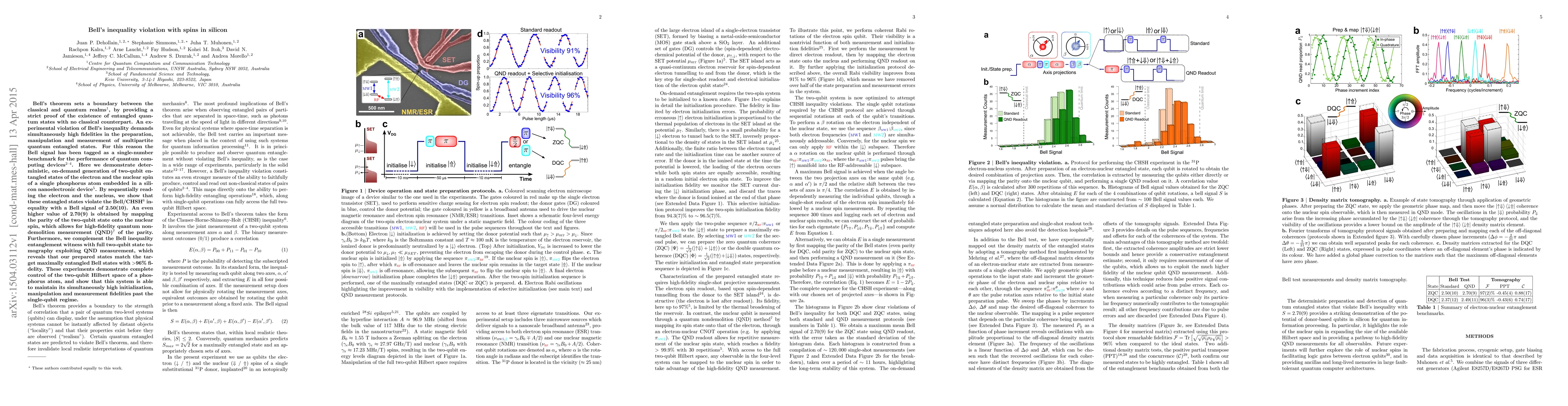 This paper demonstrates the deterministic generation of entangled electron-nuclear spin states in a silicon device, achieving a Bell inequality violation with a high fidelity of 2.50(10). The study further enhances the violation to 2.70(9) using quantum non-demolition measurement, confirming the system's capability for high-fidelity quantum operations beyond single-qubit control.