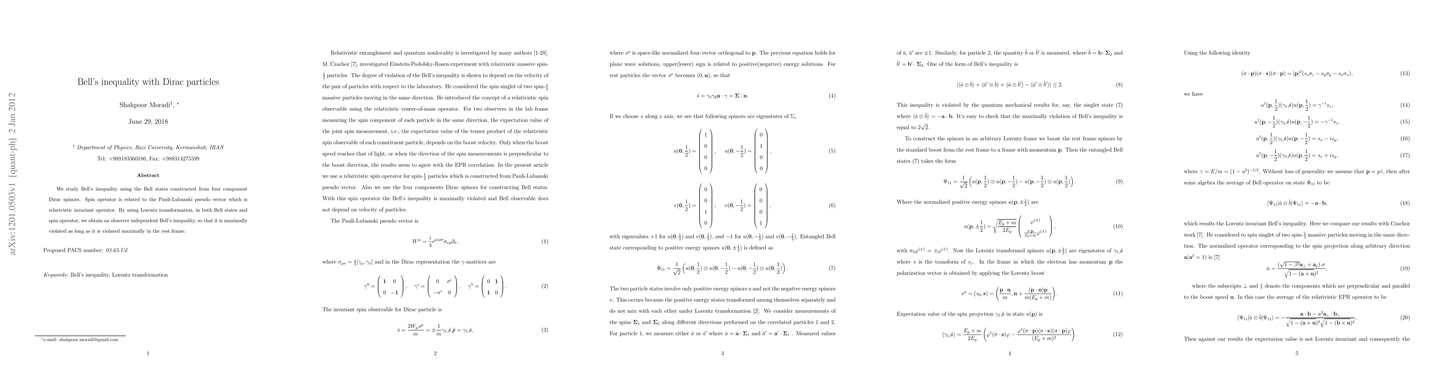 This paper investigates Bell's inequality using Dirac spinors and demonstrates that it remains maximally violated in all reference frames through Lorentz transformations, ensuring observer independence. The study connects the spin operator to the Pauli-Lubanski pseudovector, a relativistic invariant.