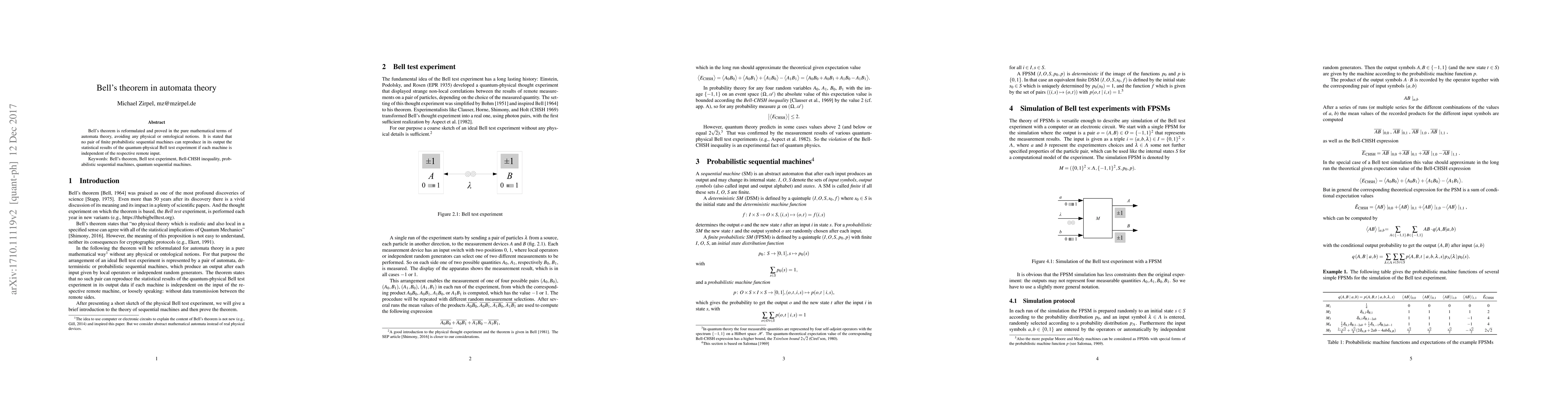 Bell's theorem is reinterpreted within automata theory, demonstrating that no pair of independent probabilistic sequential machines can replicate the statistical outcomes of quantum-physical Bell test experiments. This purely mathematical reformulation avoids physical or ontological interpretations.