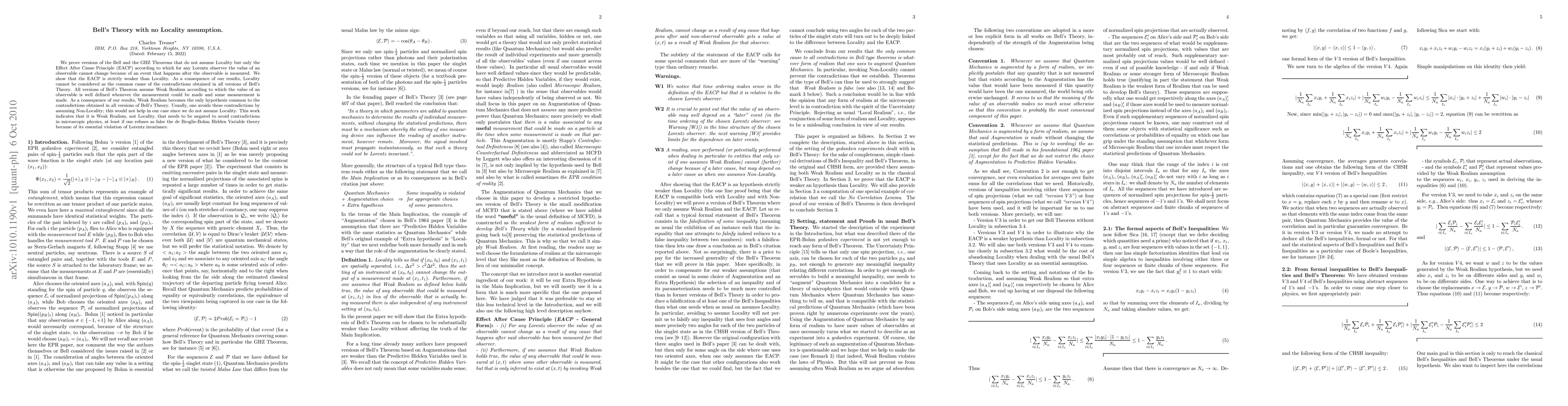 We prove versions of the Bell and the GHZ Theorems that do not assume Locality but only the Effect After Cause Principle (EACP) according to which for any Lorentz observer the value of an observable cannot change because of an event that happens after the observable is measured. We show that the EACP is strictly weaker than Locality. As a consequence of our results, Locality cannot be considered as the common cause of the contradictions obtained in all versions of Bell's Theory. All versions of Bell's Theorem assume Weak Realism according to which the value of an observable is well defined whenever the measurement could be made and some measurement is made. As a consequence of our results, Weak Realism becomes the only hypothesis common to the contradictions obtained in all versions of Bell's Theory. Usually, one avoids these contradictions by assuming Non-Locality; this would not help in our case since we do not assume Locality. This work indicates that it is Weak Realism, not Locality, that needs to be negated to avoid contradictions in microscopic physics, at least if one refuses as false the de Broglie-Bohm Hidden Variable theory because of its essential violation of Lorentz invariance.