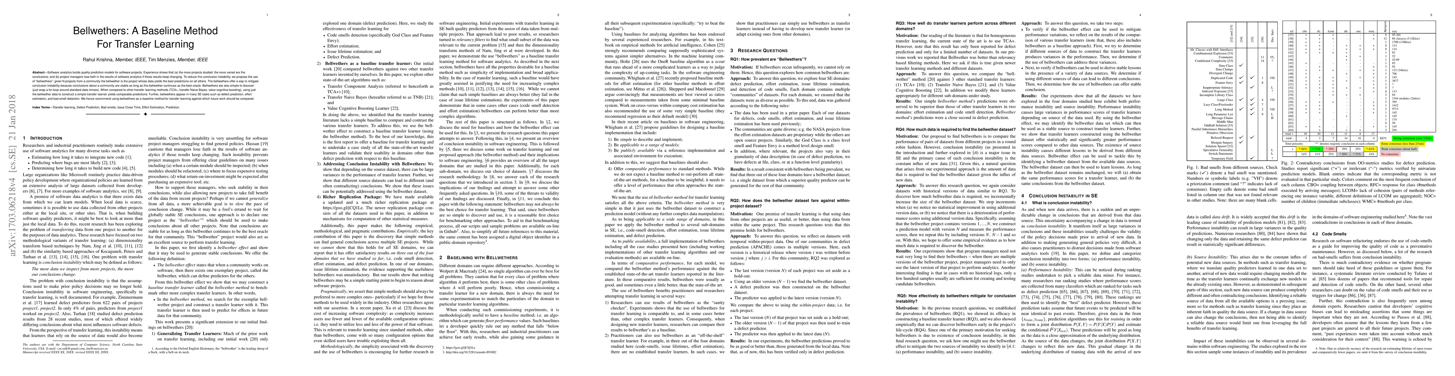 Software analytics builds quality prediction models for software projects. Experience shows that (a) the more projects studied, the more varied are the conclusions; and (b) project managers lose faith in the results of software analytics if those results keep changing. To reduce this conclusion instability, we propose the use of "bellwethers": given N projects from a community the bellwether is the project whose data yields the best predictions on all others. The bellwethers offer a way to mitigate conclusion instability because conclusions about a community are stable as long as this bellwether continues as the best oracle. Bellwethers are also simple to discover (just wrap a for-loop around standard data miners). When compared to other transfer learning methods (TCA+, transfer Naive Bayes, value cognitive boosting), using just the bellwether data to construct a simple transfer learner yields comparable predictions. Further, bellwethers appear in many SE tasks such as defect prediction, effort estimation, and bad smell detection. We hence recommend using bellwethers as a baseline method for transfer learning against which future work should be compared
