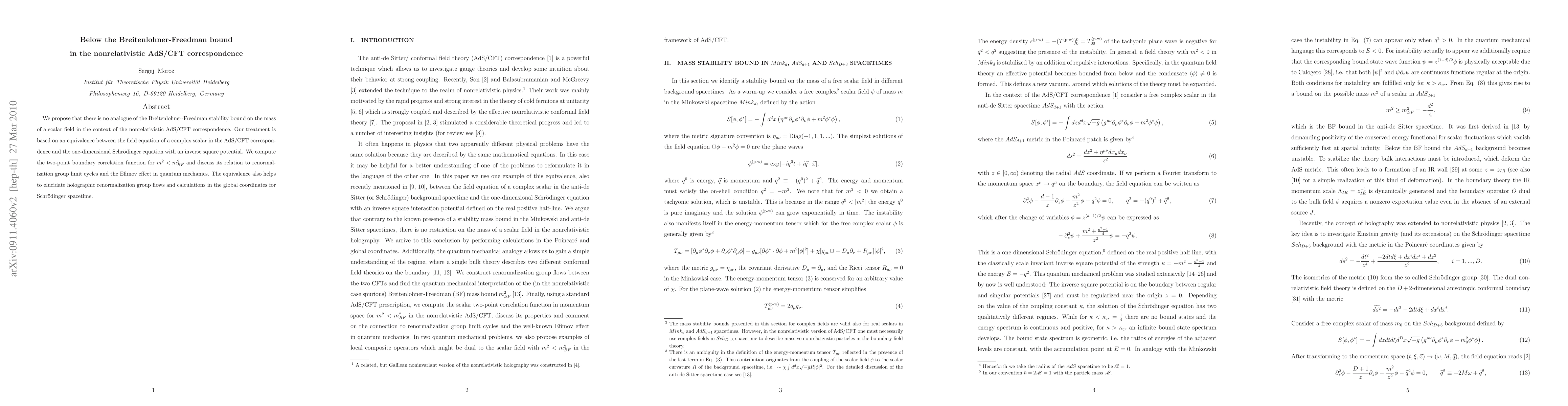 This paper proposes that the Breitenlohner-Freedman stability bound does not apply to scalar fields in the nonrelativistic AdS/CFT correspondence. The authors demonstrate an equivalence between the field equation in AdS/CFT and the one-dimensional Schrödinger equation, exploring implications for renormalization group flows and the Efimov effect.
