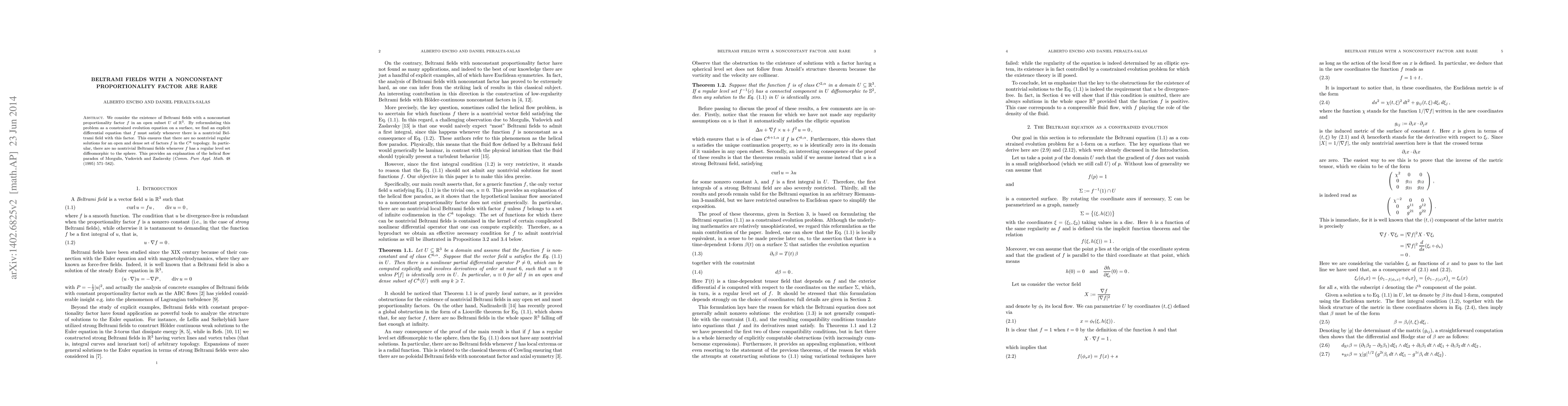 We consider the existence of Beltrami fields with a nonconstant proportionality factor $f$ in an open subset $U$ of $\mathbf{R}^3$. By reformulating this problem as a constrained evolution equation on a surface, we find an explicit differential equation that $f$ must satisfy whenever there is a nontrivial Beltrami field with this factor. This ensures that there are no nontrivial solutions for an open and dense set of factors $f$ in the $C^k$ topology. In particular, there are no nontrivial Beltrami fields whenever $f$ has a regular level set diffeomorphic to the sphere. This provides an explanation of the helical flow paradox of Morgulis, Yudovich and Zaslavsky.