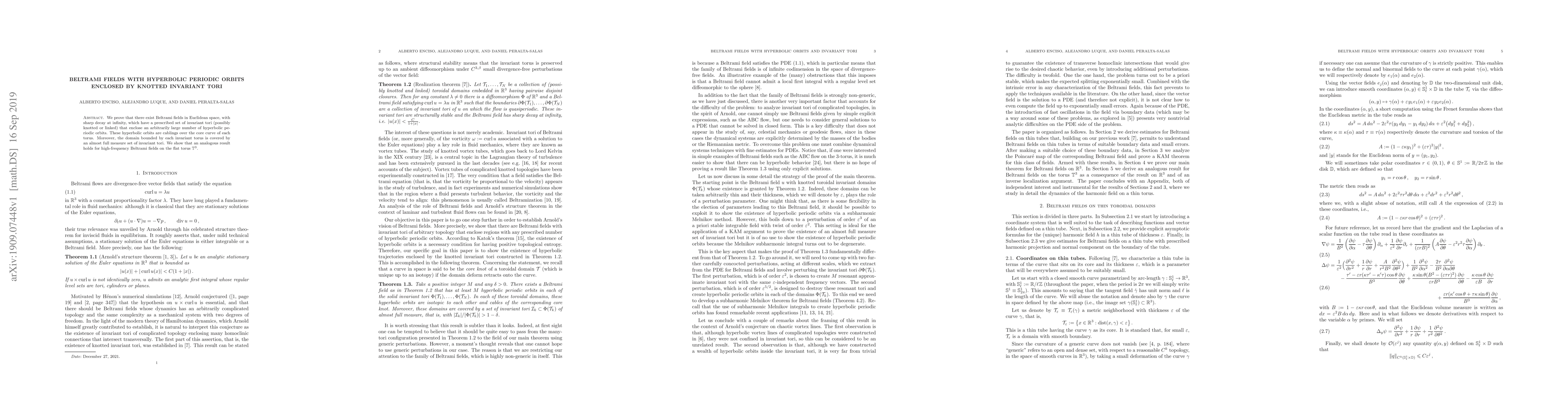 We prove that there exist Beltrami fields in Euclidean space, with sharp decay at infinity, which have a prescribed set of invariant tori (possibly knotted or linked) that enclose an arbitrarily large number of hyperbolic periodic orbits. These hyperbolic orbits are cablings over the core curve of each torus. Moreover, the domain bounded by each invariant torus is covered by an almost full measure set of invariant tori. We show that an analogous result holds for high-frequency Beltrami fields on the flat 3-torus.