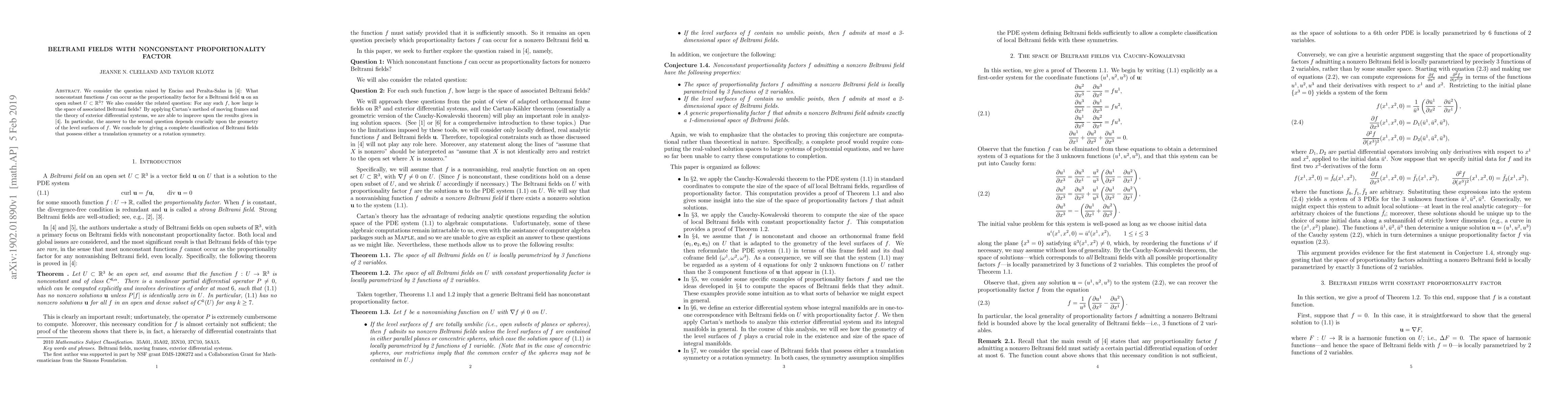 This paper investigates nonconstant functions as proportionality factors for Beltrami fields in $\mathbb{R}^3$, improving upon previous results using Cartan's method and exterior differential systems. It classifies Beltrami fields with translation or rotation symmetries and examines the geometry of the level surfaces of these functions.