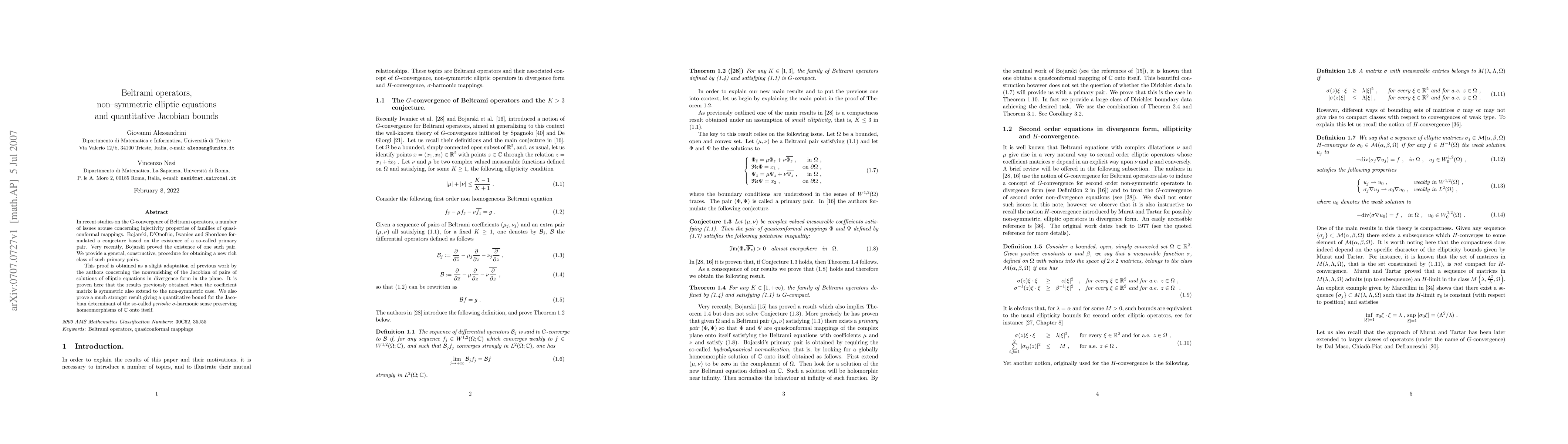 In recent studies on the G-convergence of Beltrami operators, a number of issues arouse concerning injectivity properties of families of quasiconformal mappings. Bojarski, D'Onofrio, Iwaniec and Sbordone formulated a conjecture based on the existence of a so-called primary pair. Very recently, Bojarski proved the existence of one such pair. We provide a general, constructive, procedure for obtaining a new rich class of such primary pairs. This proof is obtained as a slight adaptation of previous work by the authors concerning the nonvanishing of the Jacobian of pairs of solutions of elliptic equations in divergence form in the plane. It is proven here that the results previously obtained when the coefficient matrix is symmetric also extend to the non-symmetric case. We also prove a much stronger result giving a quantitative bound for the Jacobian determinant of the so-called \emph{periodic} $\sigma$-harmonic sense preserving homeomorphisms of $\mathbb C$ onto itself.