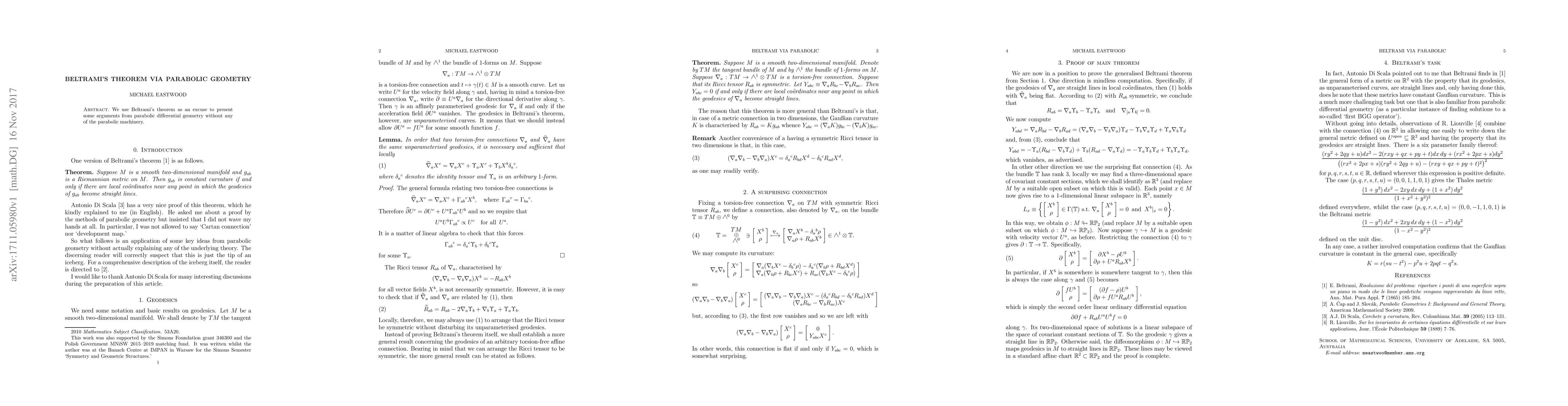 Summary: This paper presents an expository discussion on Beltrami's theorem, utilizing it as a vehicle to introduce concepts from parabolic differential geometry without relying on complex parabolic machinery. The focus is on making the material accessible to a broader audience.