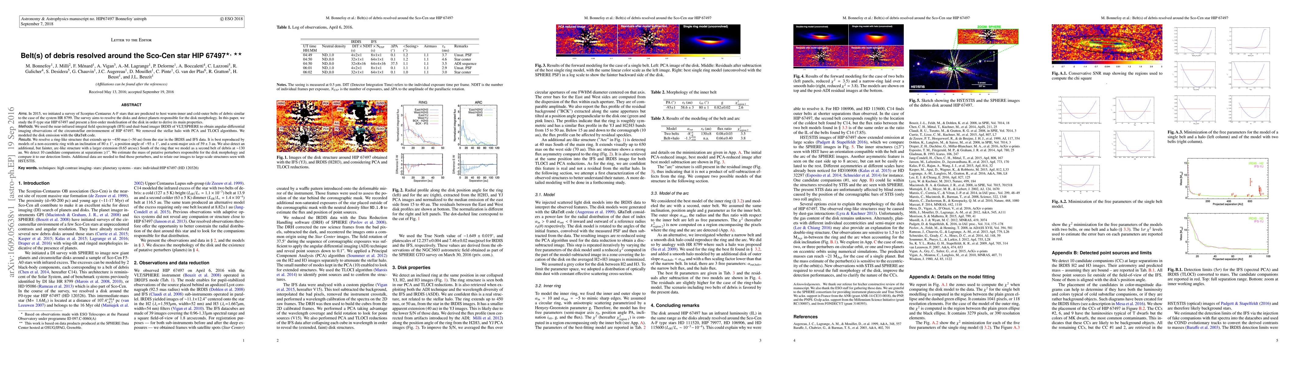 In 2015, we initiated a survey of Scorpius-Centaurus A-F stars that are predicted to host warm-inner and cold-outer belts of debris similar to the case of the system HR~8799. The survey aims to resolve the disks and detect planets responsible for the disk morphology. In this paper, we study the F-type star HIP~67497 and present a first-order modelisation of the disk in order to derive its main properties. We used the near-infrared integral field spectrograph (IFS) and dual-band imager IRDIS of VLT/SPHERE to obtain angular-differential imaging observations of the circumstellar environnement of HIP~67497. We removed the stellar halo with PCA and TLOCI algorithms. We modeled the disk emission with the GRaTeR code. We resolve a ring-like structure that extends up to $\sim$450 mas ($\sim$50 au) from the star in the IRDIS and IFS data. It is best reproduced by models of a non-eccentric ring with an inclination of $80\pm1^{\circ}$, a position angle of $-93\pm1^{\circ}$, and a semi-major axis of $59\pm3$ au. We also detect an additional, but fainter, arc-like structure with a larger extension (0.65 arcsec) South of the ring that we model as a second belt of debris at $\sim$130 au. We detect 10 candidate companions at separations $\geq$1''. We estimate the mass of putative perturbers responsible for the disk morphology and compare it to our detection limits. Additional data are needed to find those perturbers, and to relate our images to large-scale structures seen with HST/STIS.