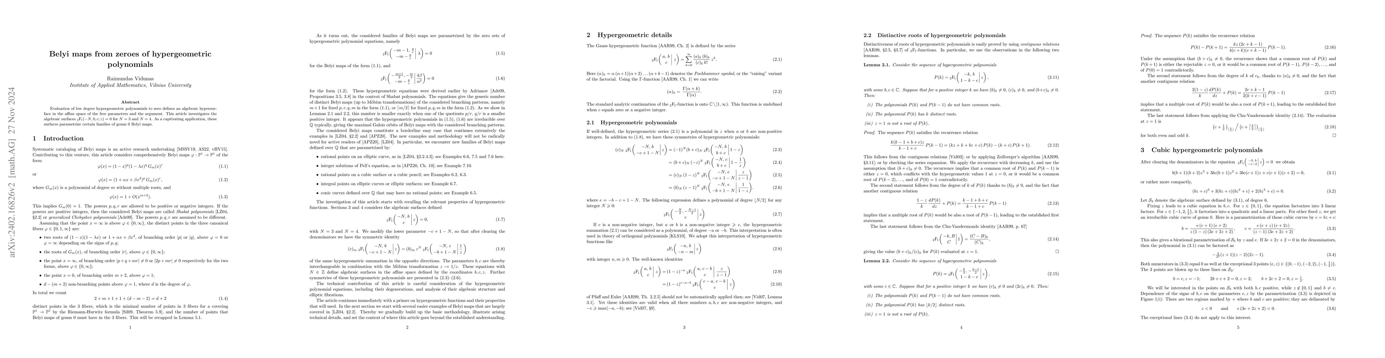 This paper explores algebraic hypersurfaces defined by zeroes of low-degree hypergeometric polynomials, specifically 2F1(-N,b;c;z)=0 for N=3 and N=4, and demonstrates their connection to parametrizing families of genus 0 Belyi maps.