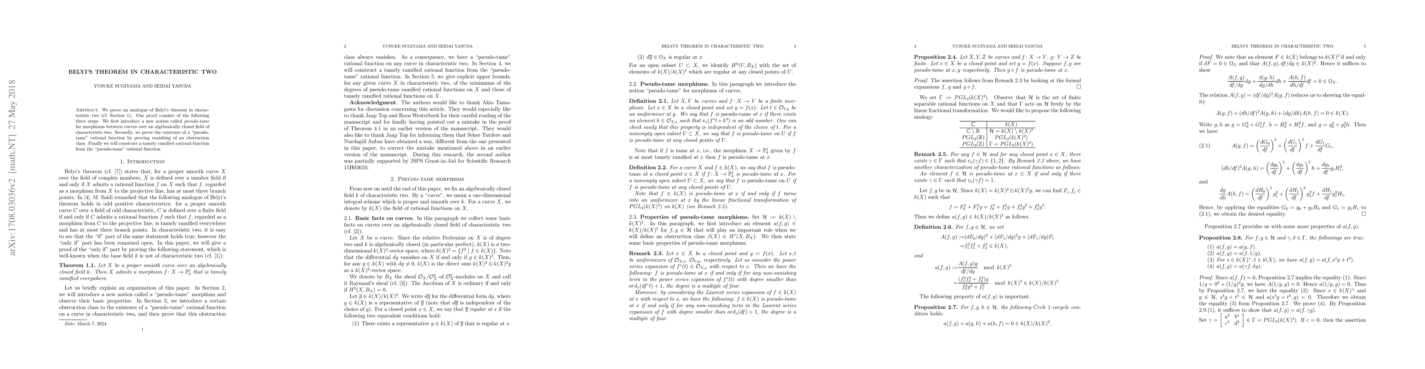 This paper proves an analogue of Belyi's theorem in characteristic two by introducing the concept of "pseudo-tame" morphisms, demonstrating the existence of a "pseudo-tame" rational function, and constructing a tamely ramified rational function from it.