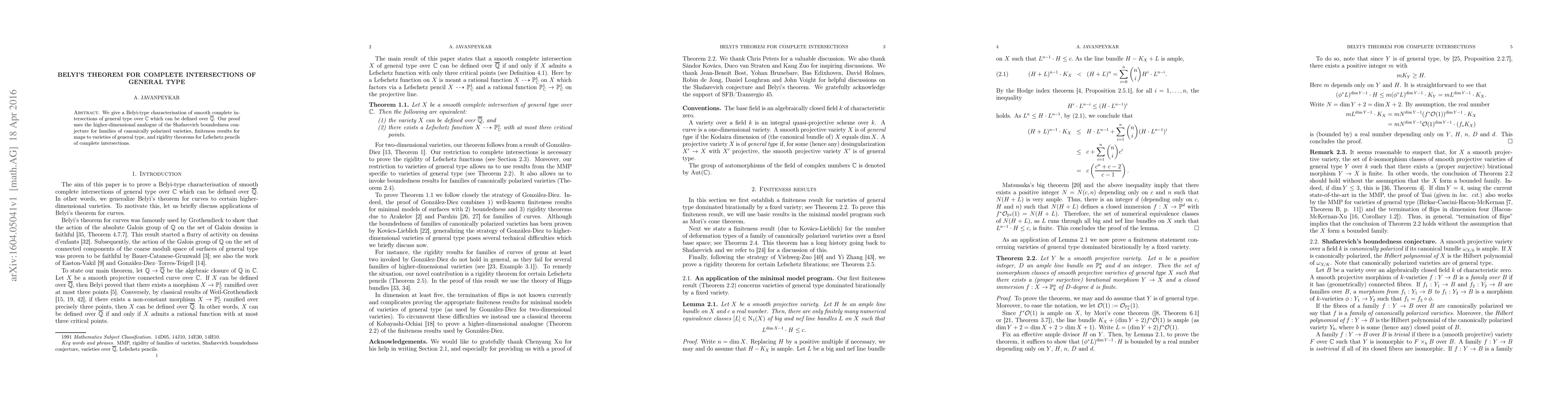 Belyi's theorem is extended to smooth complete intersections of general type over $\mathbb{C}$, showing they can be defined over $\bar{\mathbb{Q}}$. The proof leverages the Shafarevich conjecture, finiteness results for maps, and rigidity theorems for Lefschetz pencils.