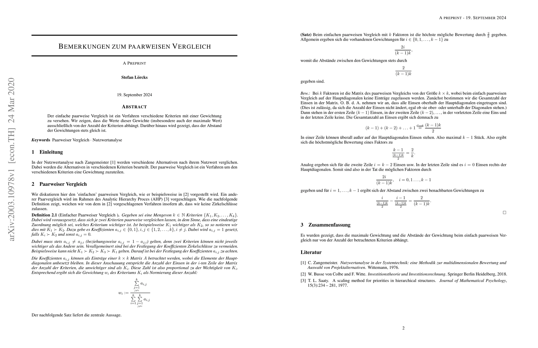 The simple pairwise comparison is a method to provide different criteria with weights. We show that the values of those weights (in particular the maximum) depend just on the number of criteria. Additionally, it is shown that the distance between the weights is always the same. ----- Der einfache paarweise Vergleich ist ein Verfahren verschiedene Kriterien mit einer Gewichtung zu versehen. Wir zeigen, dass die Werte dieser Gewichte (insbesondere auch der maximale Wert) ausschlie{\ss}lich von der Anzahl der Kriterien abh\"angt. Dar\"uber hinaus wird gezeigt, dass der Abstand der Gewichtungen stets gleich ist.