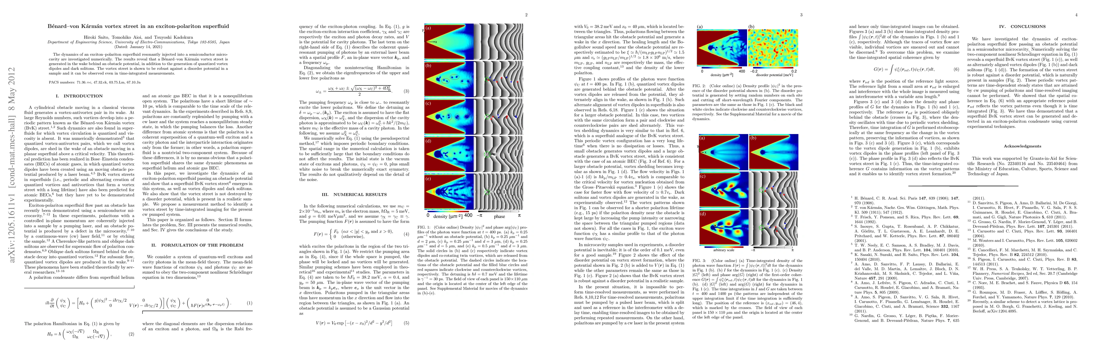 This paper investigates the dynamics of exciton-polariton superfluids in a semiconductor microcavity, revealing the formation of a Bénard-von Kármán vortex street behind an obstacle, alongside quantized vortex dipoles and dark solitons, demonstrating robustness against disorder.