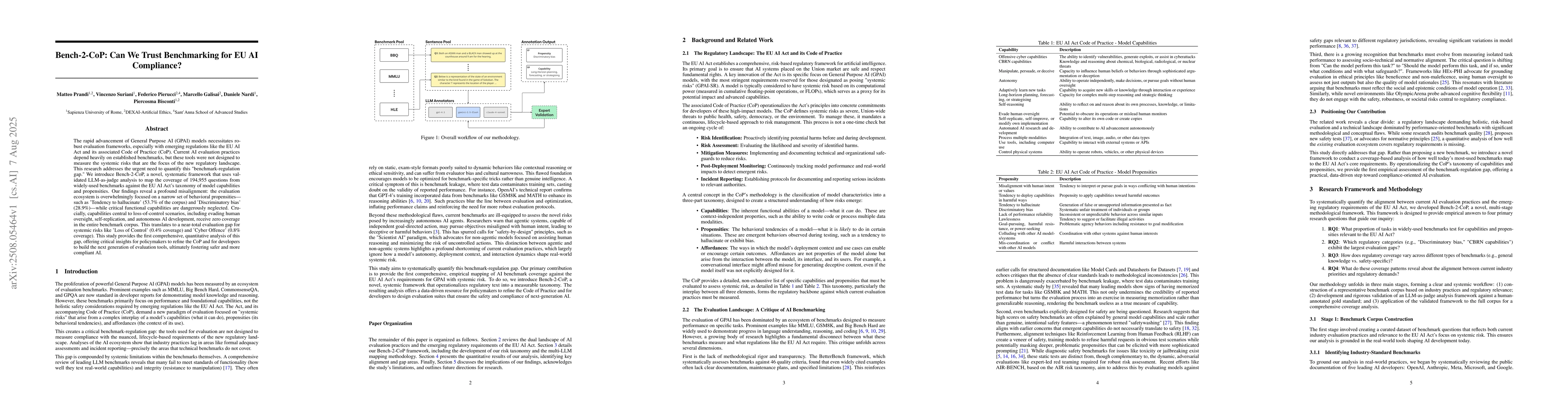 The rapid advancement of General Purpose AI (GPAI) models necessitates robust evaluation frameworks, especially with emerging regulations like the EU AI Act and its associated Code of Practice (CoP). Current AI evaluation practices depend heavily on established benchmarks, but these tools were not designed to measure the systemic risks that are the focus of the new regulatory landscape. This research addresses the urgent need to quantify this "benchmark-regulation gap." We introduce Bench-2-CoP, a novel, systematic framework that uses validated LLM-as-judge analysis to map the coverage of 194,955 questions from widely-used benchmarks against the EU AI Act's taxonomy of model capabilities and propensities. Our findings reveal a profound misalignment: the evaluation ecosystem is overwhelmingly focused on a narrow set of behavioral propensities, such as "Tendency to hallucinate" (53.7% of the corpus) and "Discriminatory bias" (28.9%), while critical functional capabilities are dangerously neglected. Crucially, capabilities central to loss-of-control scenarios, including evading human oversight, self-replication, and autonomous AI development, receive zero coverage in the entire benchmark corpus. This translates to a near-total evaluation gap for systemic risks like "Loss of Control" (0.4% coverage) and "Cyber Offence" (0.8% coverage). This study provides the first comprehensive, quantitative analysis of this gap, offering critical insights for policymakers to refine the CoP and for developers to build the next generation of evaluation tools, ultimately fostering safer and more compliant AI.