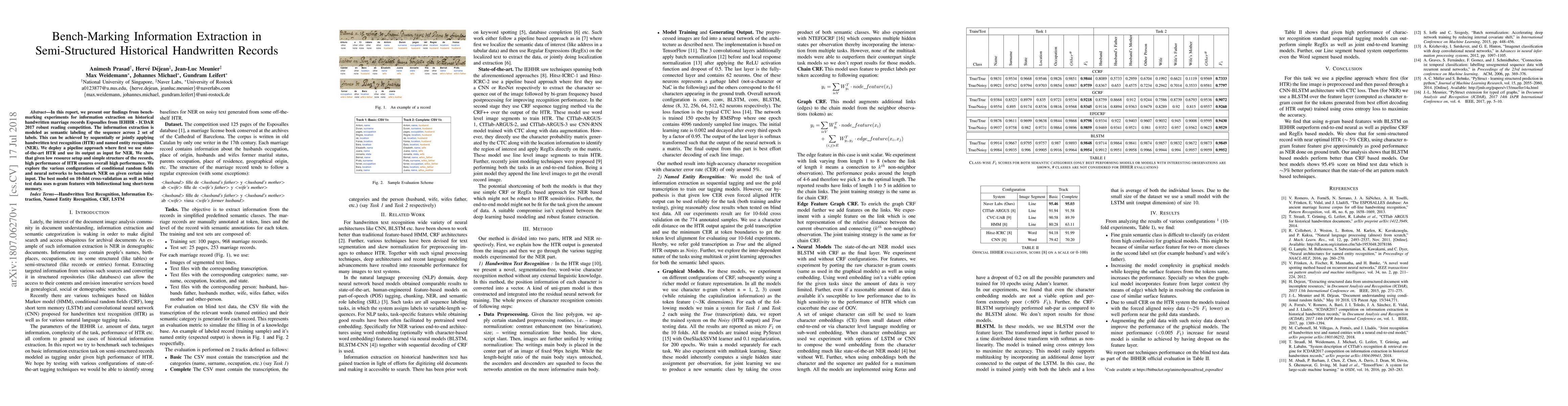 In this report, we present our findings from benchmarking experiments for information extraction on historical handwritten marriage records Esposalles from IEHHR - ICDAR 2017 robust reading competition. The information extraction is modeled as semantic labeling of the sequence across 2 set of labels. This can be achieved by sequentially or jointly applying handwritten text recognition (HTR) and named entity recognition (NER). We deploy a pipeline approach where first we use state-of-the-art HTR and use its output as input for NER. We show that given low resource setup and simple structure of the records, high performance of HTR ensures overall high performance. We explore the various configurations of conditional random fields and neural networks to benchmark NER on given certain noisy input. The best model on 10-fold cross-validation as well as blind test data uses n-gram features with bidirectional long short-term memory.