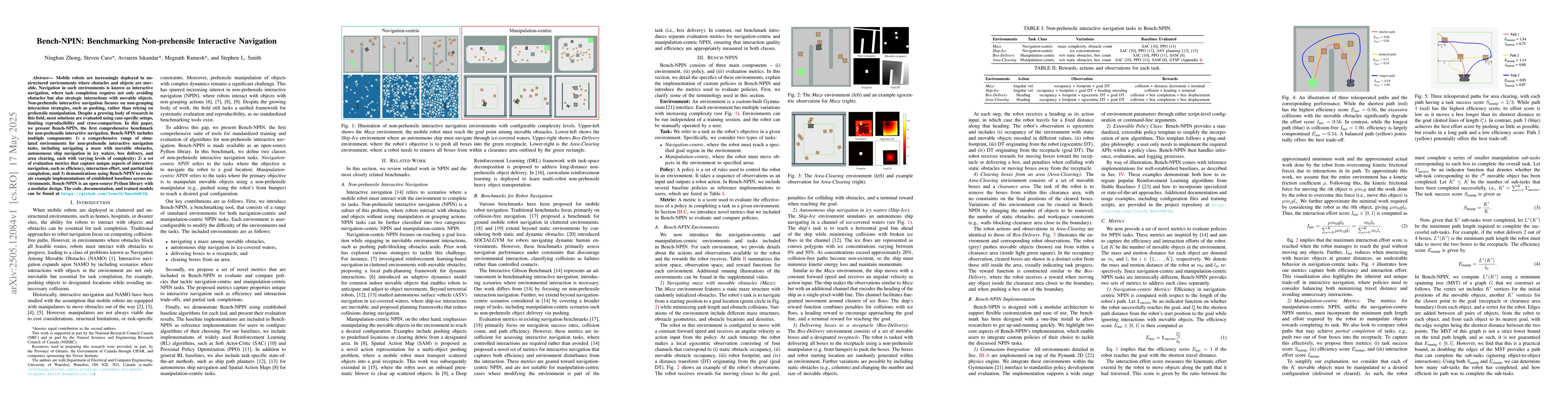The paper introduces Bench-NPIN, a comprehensive benchmark for non-prehensile interactive navigation, comprising simulated environments, evaluation metrics, and demonstrations using example implementations of established baselines.