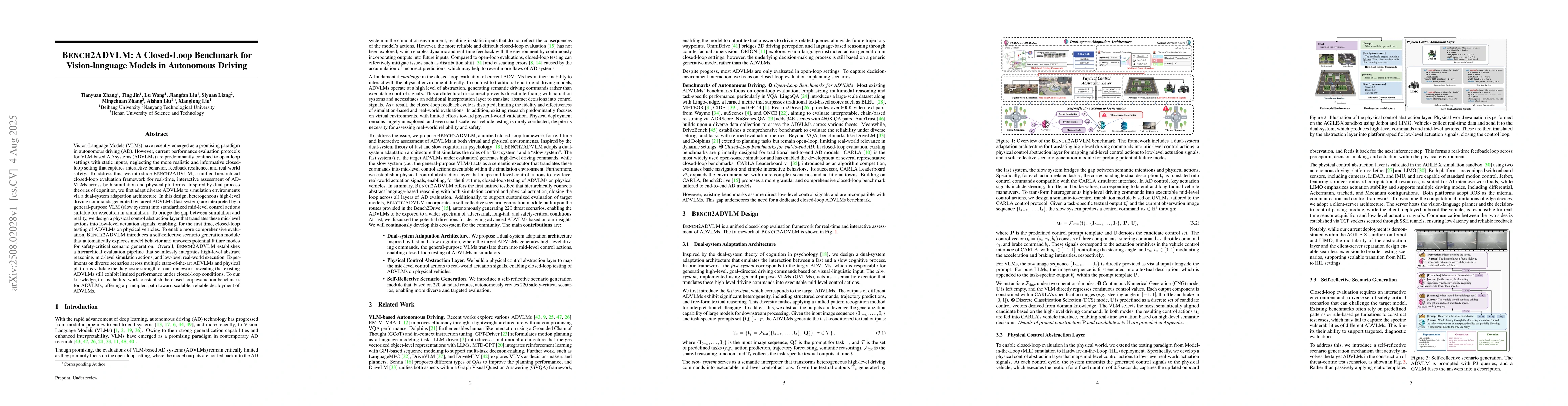 Vision-Language Models (VLMs) have recently emerged as a promising paradigm in autonomous driving (AD). However, current performance evaluation protocols for VLM-based AD systems (ADVLMs) are predominantly confined to open-loop settings with static inputs, neglecting the more realistic and informative closed-loop setting that captures interactive behavior, feedback resilience, and real-world safety. To address this, we introduce Bench2ADVLM, a unified hierarchical closed-loop evaluation framework for real-time, interactive assessment of ADVLMs across both simulation and physical platforms. Inspired by dual-process theories of cognition, we first adapt diverse ADVLMs to simulation environments via a dual-system adaptation architecture. In this design, heterogeneous high-level driving commands generated by target ADVLMs (fast system) are interpreted by a general-purpose VLM (slow system) into standardized mid-level control actions suitable for execution in simulation. To bridge the gap between simulation and reality, we design a physical control abstraction layer that translates these mid-level actions into low-level actuation signals, enabling, for the first time, closed-loop testing of ADVLMs on physical vehicles. To enable more comprehensive evaluation, Bench2ADVLM introduces a self-reflective scenario generation module that automatically explores model behavior and uncovers potential failure modes for safety-critical scenario generation. Overall, Bench2ADVLM establishes a hierarchical evaluation pipeline that seamlessly integrates high-level abstract reasoning, mid-level simulation actions, and low-level real-world execution. Experiments on diverse scenarios across multiple state-of-the-art ADVLMs and physical platforms validate the diagnostic strength of our framework, revealing that existing ADVLMs still exhibit limited performance under closed-loop conditions.