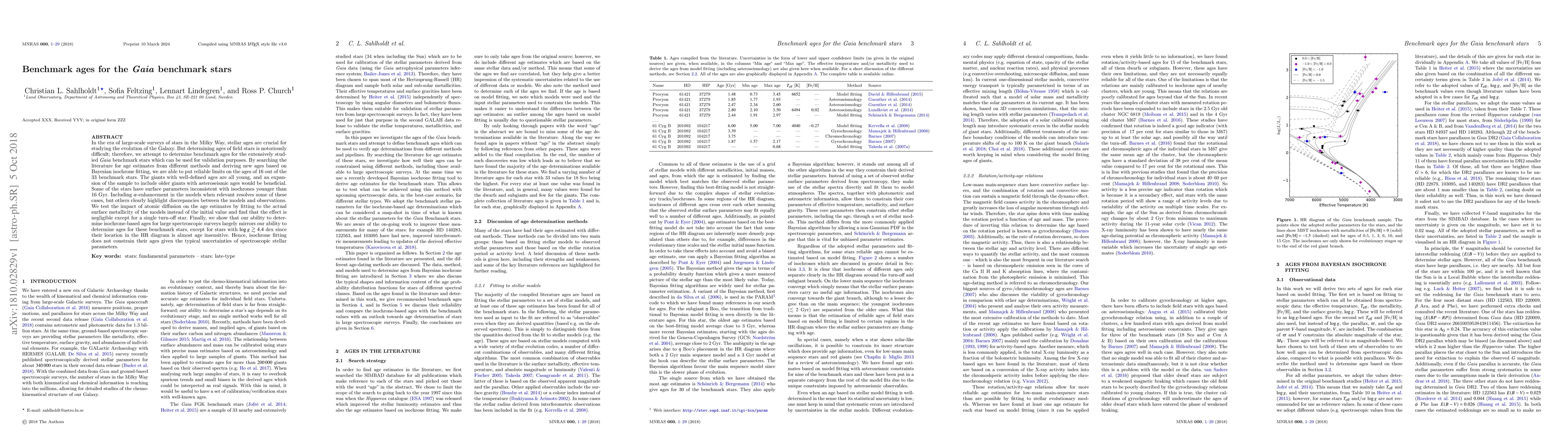 In the era of large-scale surveys of stars in the Milky Way, stellar ages are crucial for studying the evolution of the Galaxy. But determining ages of field stars is notoriously difficult; therefore, we attempt to determine benchmark ages for the extensively studied Gaia benchmark stars which can be used for validation purposes. By searching the literature for age estimates from different methods and deriving new ages based on Bayesian isochrone fitting, we are able to put reliable limits on the ages of 16 out of the 33 benchmark stars. The giants with well-defined ages are all young, and an expansion of the sample to include older giants with asteroseismic ages would be beneficial. Some of the stars have surface parameters inconsistent with isochrones younger than 16 Gyr. Including $\alpha$-enhancement in the models when relevant resolves some of these cases, but others clearly highlight discrepancies between the models and observations. We test the impact of atomic diffusion on the age estimates by fitting to the actual surface metallicity of the models instead of the initial value and find that the effect is negligible except for a single turn-off star. Finally, we show that our ability to determine isochrone-based ages for large spectroscopic surveys largely mirrors our ability to determine ages for these benchmark stars, except for stars with $\log g \gtrsim 4.4$ dex since their location in the HR diagram is almost age insensitive. Hence, isochrone fitting does not constrain their ages given the typical uncertainties of spectroscopic stellar parameters.