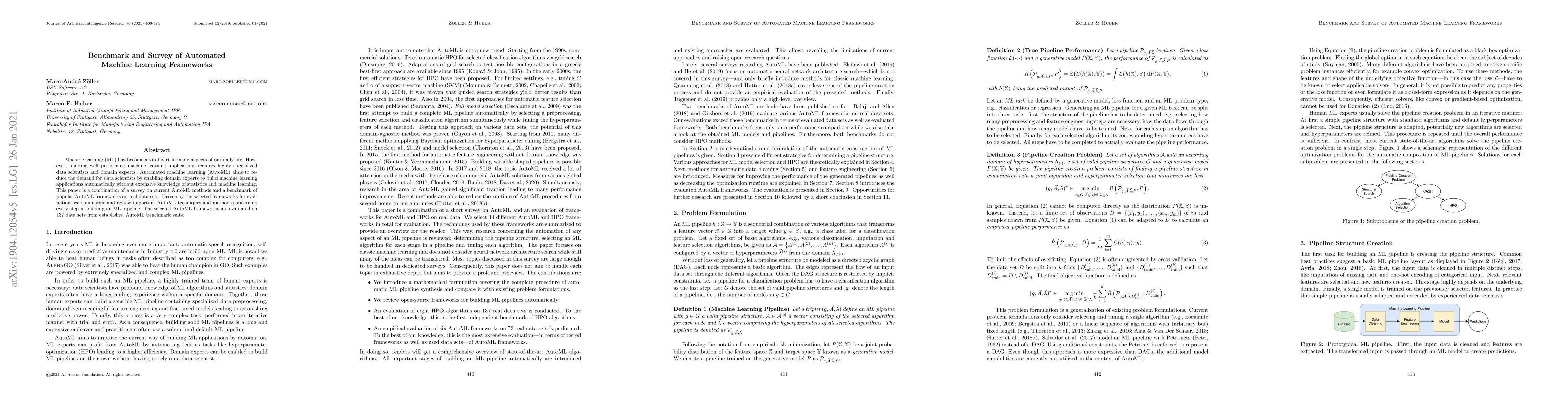 Machine learning (ML) has become a vital part in many aspects of our daily life. However, building well performing machine learning applications requires highly specialized data scientists and domain experts. Automated machine learning (AutoML) aims to reduce the demand for data scientists by enabling domain experts to build machine learning applications automatically without extensive knowledge of statistics and machine learning. This paper is a combination of a survey on current AutoML methods and a benchmark of popular AutoML frameworks on real data sets. Driven by the selected frameworks for evaluation, we summarize and review important AutoML techniques and methods concerning every step in building an ML pipeline. The selected AutoML frameworks are evaluated on 137 data sets from established AutoML benchmark suits.