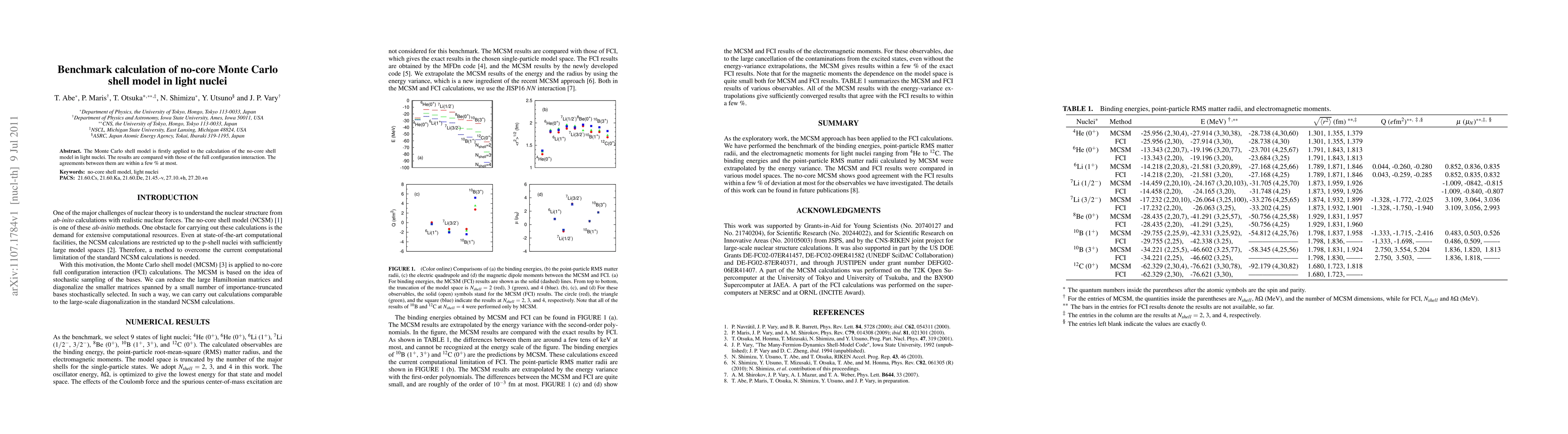 This paper benchmarks the Monte Carlo shell model for the no-core shell model in light nuclei, finding agreement within a few percent when compared to full configuration interaction calculations. The results demonstrate the potential of the Monte Carlo method for nuclear structure studies.
