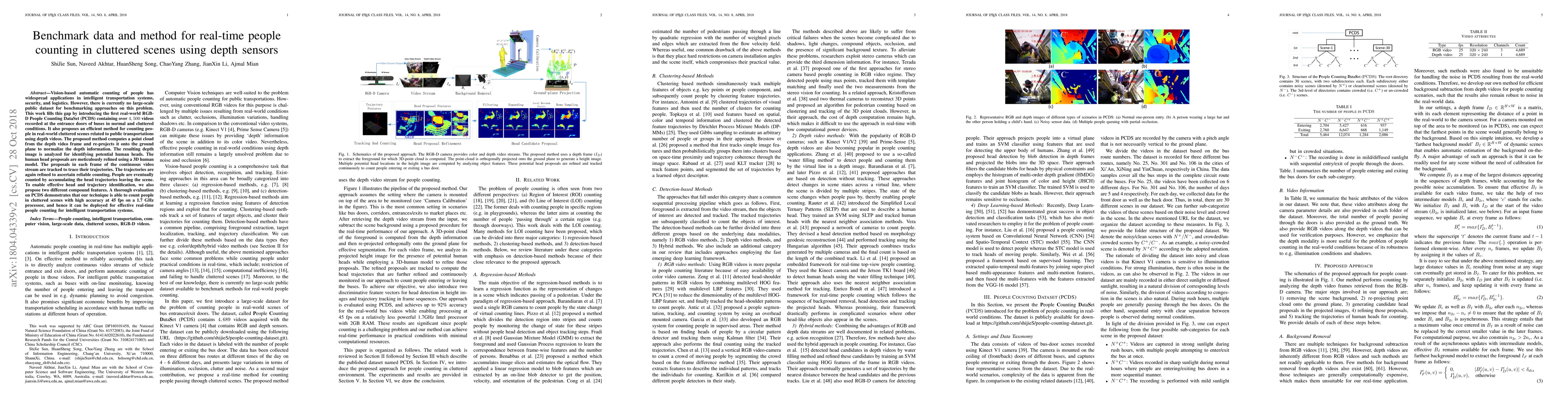 Vision-based automatic counting of people has widespread applications in intelligent transportation systems, security, and logistics. However, there is currently no large-scale public dataset for benchmarking approaches on this problem. This work fills this gap by introducing the first real-world RGB-D People Counting DataSet (PCDS) containing over 4,500 videos recorded at the entrance doors of buses in normal and cluttered conditions. It also proposes an efficient method for counting people in real-world cluttered scenes related to public transportations using depth videos. The proposed method computes a point cloud from the depth video frame and re-projects it onto the ground plane to normalize the depth information. The resulting depth image is analyzed for identifying potential human heads. The human head proposals are meticulously refined using a 3D human model. The proposals in each frame of the continuous video stream are tracked to trace their trajectories. The trajectories are again refined to ascertain reliable counting. People are eventually counted by accumulating the head trajectories leaving the scene. To enable effective head and trajectory identification, we also propose two different compound features. A thorough evaluation on PCDS demonstrates that our technique is able to count people in cluttered scenes with high accuracy at 45 fps on a 1.7 GHz processor, and hence it can be deployed for effective real-time people counting for intelligent transportation systems.