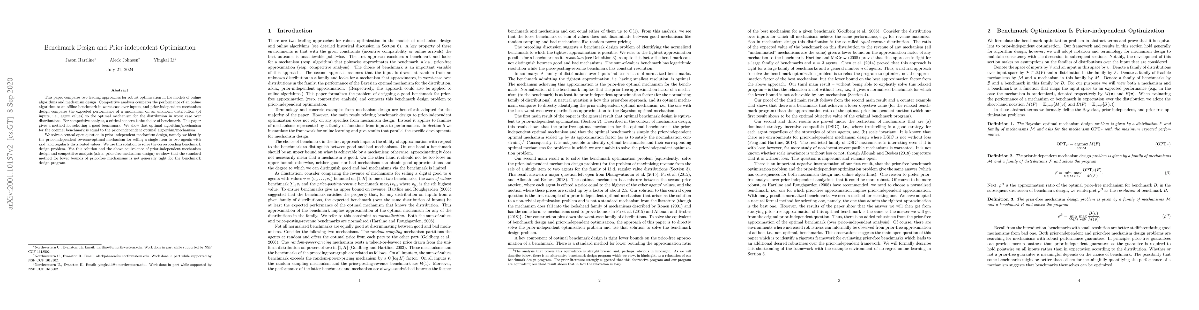 This paper compares robust optimization methods in online algorithms and mechanism design, proposing a method for selecting a good benchmark for competitive analysis. It identifies the prior-independent revenue-optimal mechanism for selling a single item to two agents, demonstrating that the standard method for lower bounds is not generally tight.