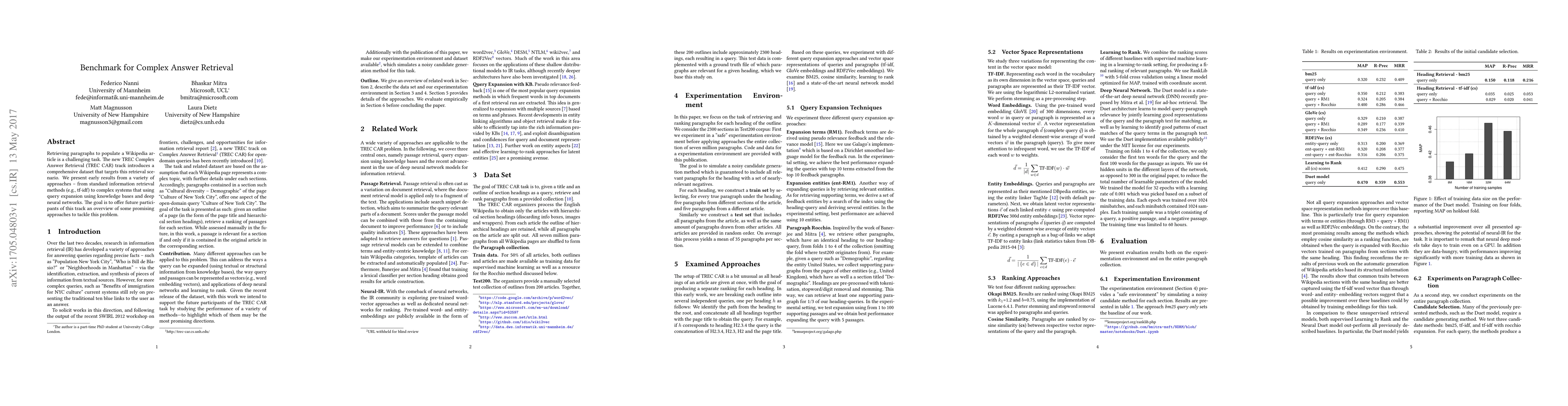 Retrieving paragraphs to populate a Wikipedia article is a challenging task. The new TREC Complex Answer Retrieval (TREC CAR) track introduces a comprehensive dataset that targets this retrieval scenario. We present early results from a variety of approaches -- from standard information retrieval methods (e.g., tf-idf) to complex systems that using query expansion using knowledge bases and deep neural networks. The goal is to offer future participants of this track an overview of some promising approaches to tackle this problem.