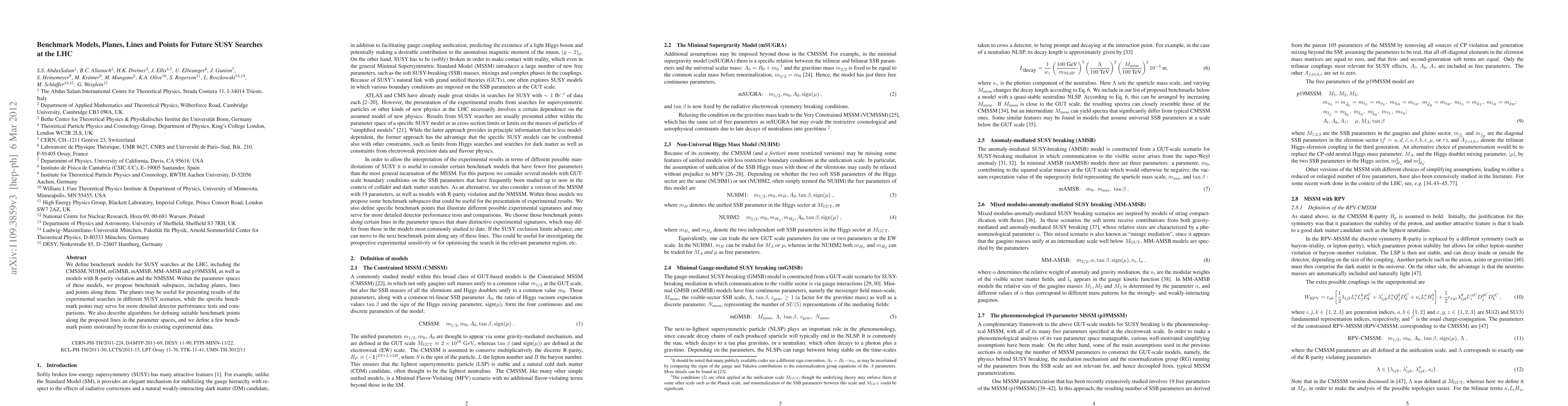 This paper defines benchmark models and subspaces for SUSY searches at the LHC, including various scenarios like CMSSM and NUHM, and proposes specific planes, lines, and points for experimental results presentation and detector performance tests. Algorithms for defining these benchmarks are also provided, along with points motivated by recent experimental data fits.