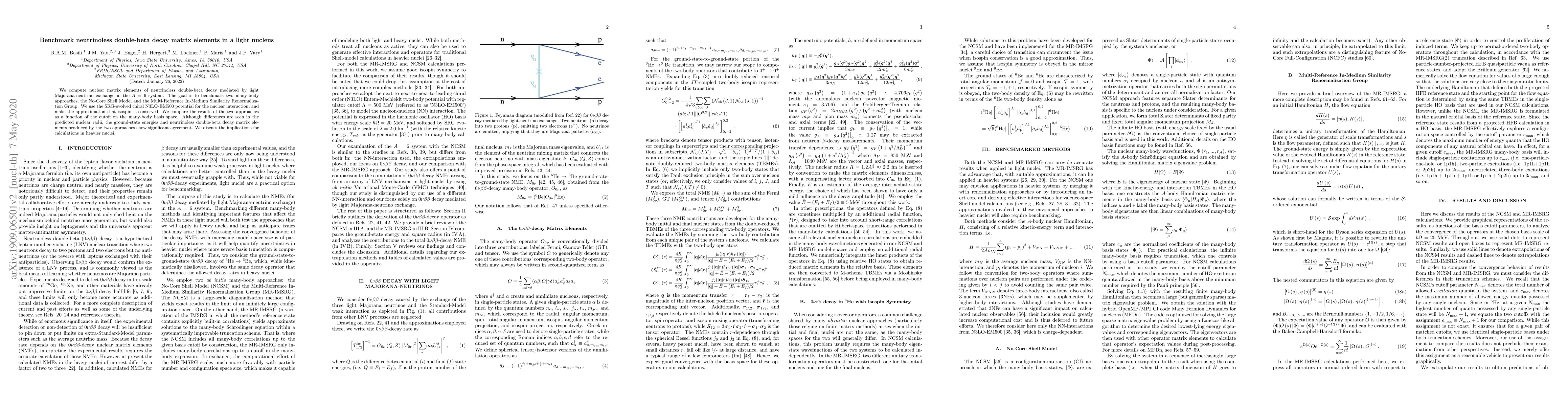 We compute nuclear matrix elements of neutrinoless double-beta decay mediated by light Majorana-neutrino exchange in the A = 6 system. The goal is to benchmark two many-body approaches, the No-Core Shell Model and the Multi-Reference In-Medium Similarity Renormalization Group. We use the SRG-evolved chiral N3LO-EM500 potential for the nuclear interaction, and make the approximation that isospin is conserved. We compare the results of the two approaches as a function of the cutoff on the many-body basis space. Although differences are seen in the predicted nuclear radii, the ground-state energies and neutrinoless double-beta decay matrix elements produced by the two approaches show significant agreement. We discuss the implications for calculations in heavier nuclei.