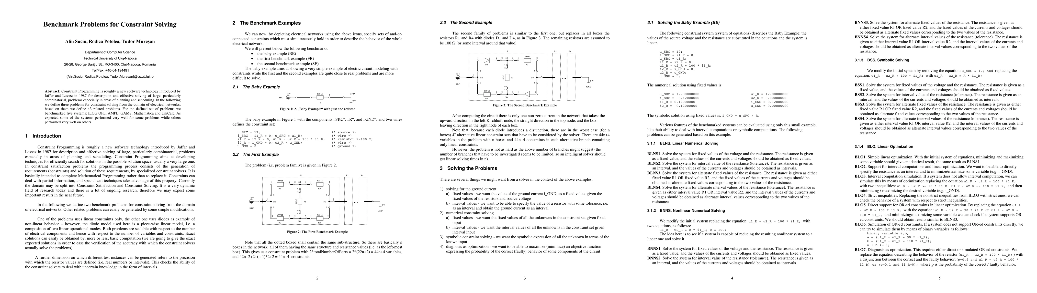 Constraint Programming is roughly a new software technology introduced by Jaffar and Lassez in 1987 for description and effective solving of large, particularly combinatorial, problems especially in areas of planning and scheduling. In the following we define three problems for constraint solving from the domain of electrical networks; based on them we define 43 related problems. For the defined set of problems we benchmarked five systems: ILOG OPL, AMPL, GAMS, Mathematica and UniCalc. As expected some of the systems performed very well for some problems while others performed very well on others.