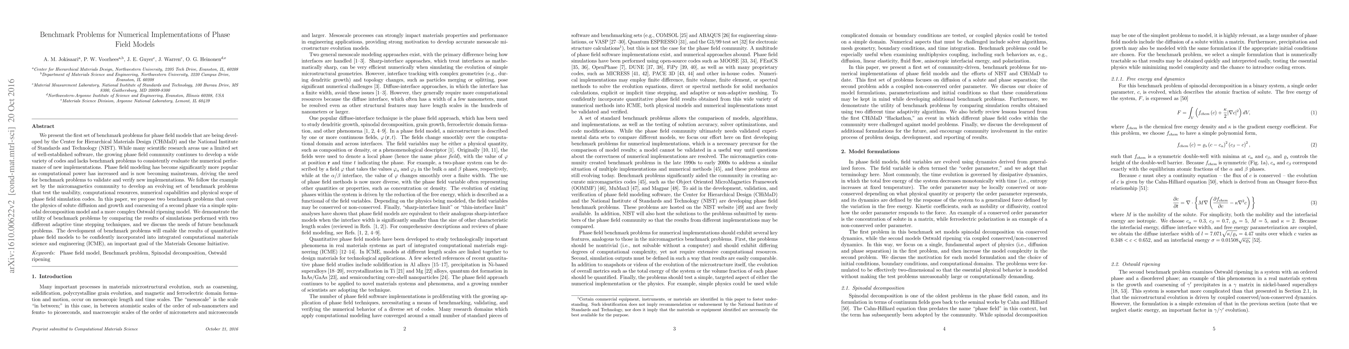 We present the first set of benchmark problems for phase field models that are being developed by the Center for Hierarchical Materials Design (CHiMaD) and the National Institute of Standards and Technology (NIST). While many scientific research areas use a limited set of well-established software, the growing phase field community continues to develop a wide variety of codes and lacks benchmark problems to consistently evaluate the numerical performance of new implementations. Phase field modeling has become significantly more popular as computational power has increased and is now becoming mainstream, driving the need for benchmark problems to validate and verify new implementations. We follow the example set by the micromagnetics community to develop an evolving set of benchmark problems that test the usability, computational resources, numerical capabilities and physical scope of phase field simulation codes. In this paper, we propose two benchmark problems that cover the physics of solute diffusion and growth and coarsening of a second phase via a simple spinodal decomposition model and a more complex Ostwald ripening model. We demonstrate the utility of benchmark problems by comparing the results of simulations performed with two different adaptive time stepping techniques, and we discuss the needs of future benchmark problems. The development of benchmark problems will enable the results of quantitative phase field models to be confidently incorporated into integrated computational materials science and engineering (ICME), an important goal of the Materials Genome Initiative.